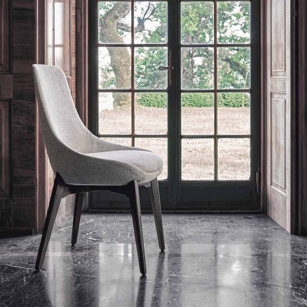 Modern chair for dining room or kitchen made in Italy with internal steel frame covered in cold-foamed polyurethane and entirely covered in fabric (not removable) with wooden base in eucalyptus finish . An imposing and impactful but at the same time simple and essential aesthetic characterizes this seat with a modern soul. Its shapes express and maximize the concept of well-being, leaving the body ample freedom of movement and offering a comfortable and welcoming solution that invites you to sit down to fully enjoy unparalleled comfort. Together with functionality, it presents at the same time a minimal design capable of characterizing any environment thanks to its delicate elegance and its exclusive personality.