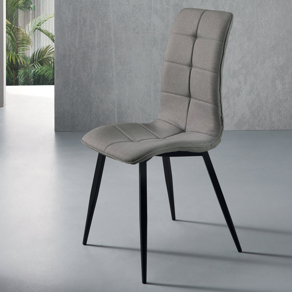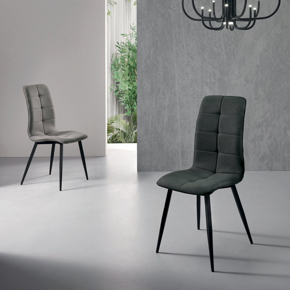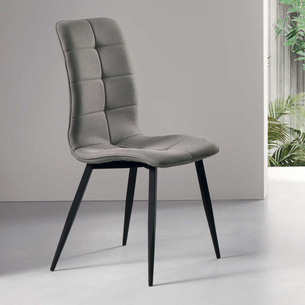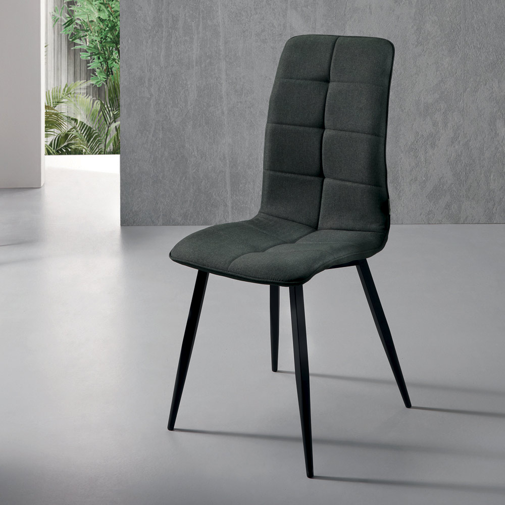 Dining room chair made of fabric with black painted metal structure . Characterized by the quilted backrest that gives originality, with a modern and linear design , this furnishing accessory with an elegant soul has a large and high backrest which ensures a soft and welcoming seat andoptimal comfort . Every single chair brings together style, quality, design and elegance. Thanks to its sinuous, simple and stylized lines it is suitable for any type of furniture.