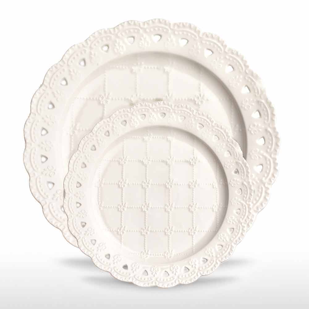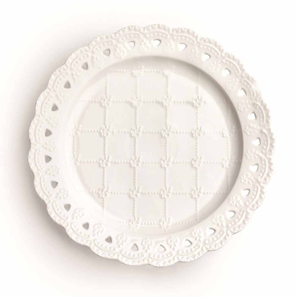 The high quality porcelain plate was created to decorate the table with refined beauty and romance. Used as a gift wedding favor because of its highly elegant and refined character, its peculiarity is given by the marked aesthetic finesse, enriched by the refined edges with floral reliefs and hand-perforated decorations that enhance the dishes making the table glamorous and classy. The dish has an expression inspired by a Baroque style design , full of romance and sweet memories.