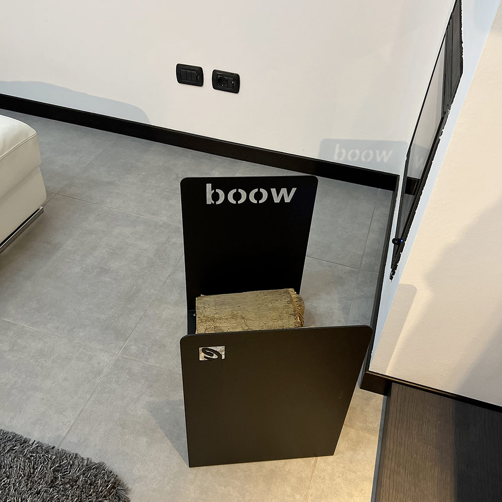 Firewood holder for fireplace made of high quality non-toxic powder coated steel. Designed and designed entirely in Italy, with the aim of highlighting not only the usefulness of the log holder itself, but also its aesthetic value.