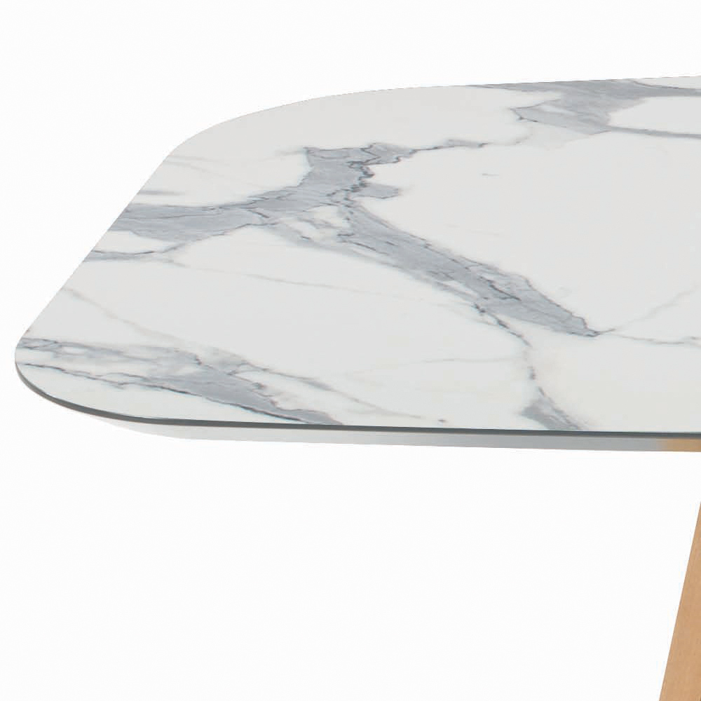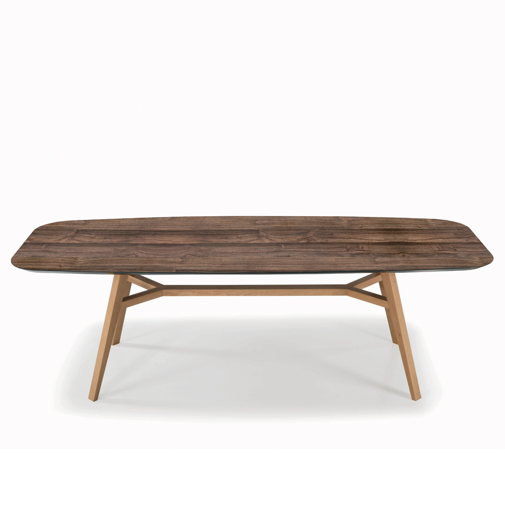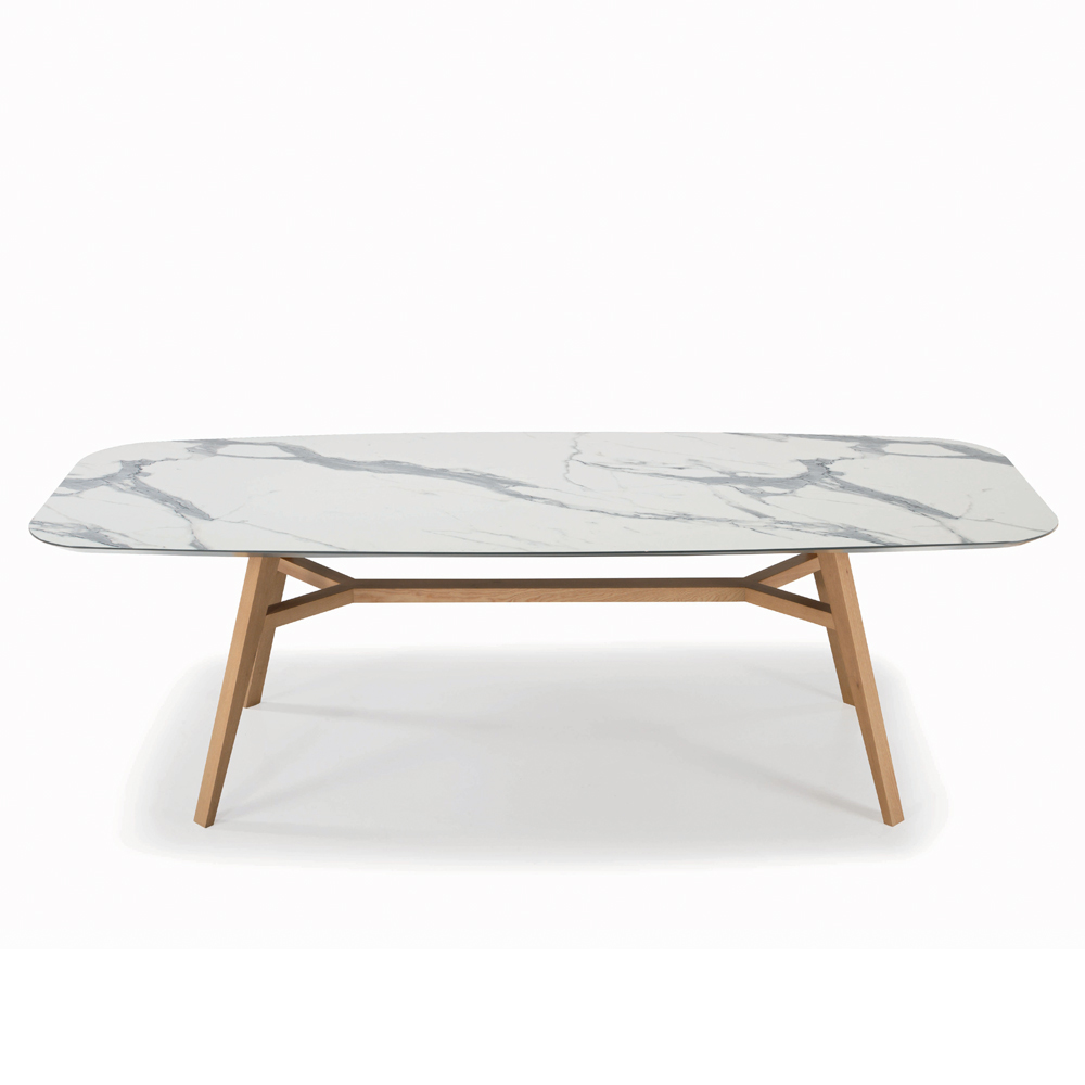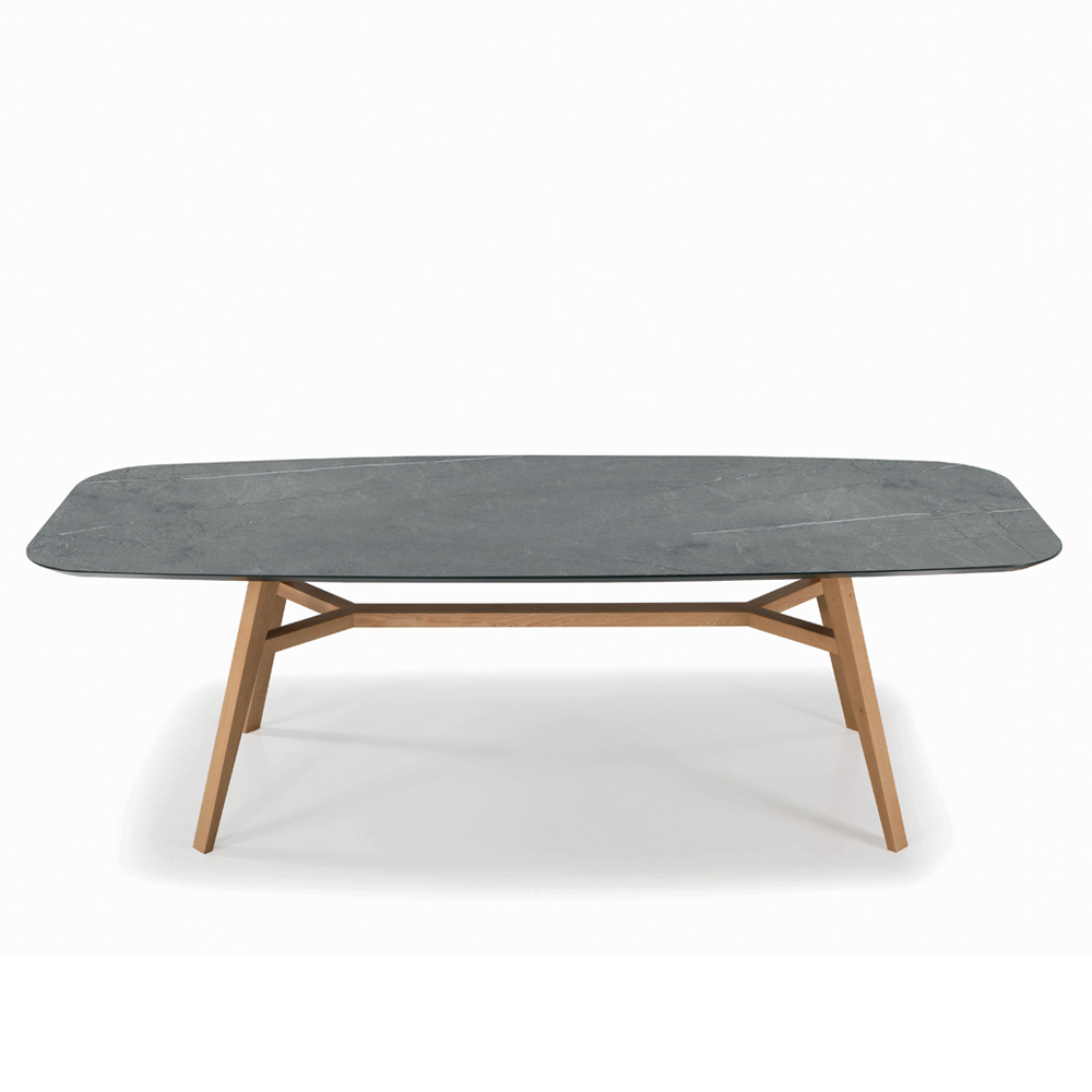 Fixed barrel-shaped living room table with laminate top,30° bevelled edge, ash wood base with natural oak finish . This product with a modern style has the primary objective of being able to be used daily without sacrificing design. The product chain, from conception to production, up to quality control, is carried out entirely in Italy , in order to guarantee and preserve the typical characteristic of Italian "know-how" and the importance of typical Made in Italy.