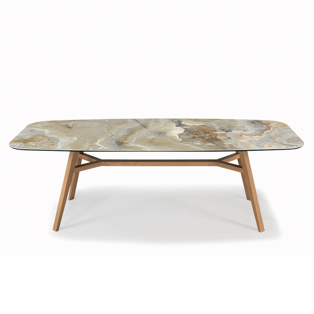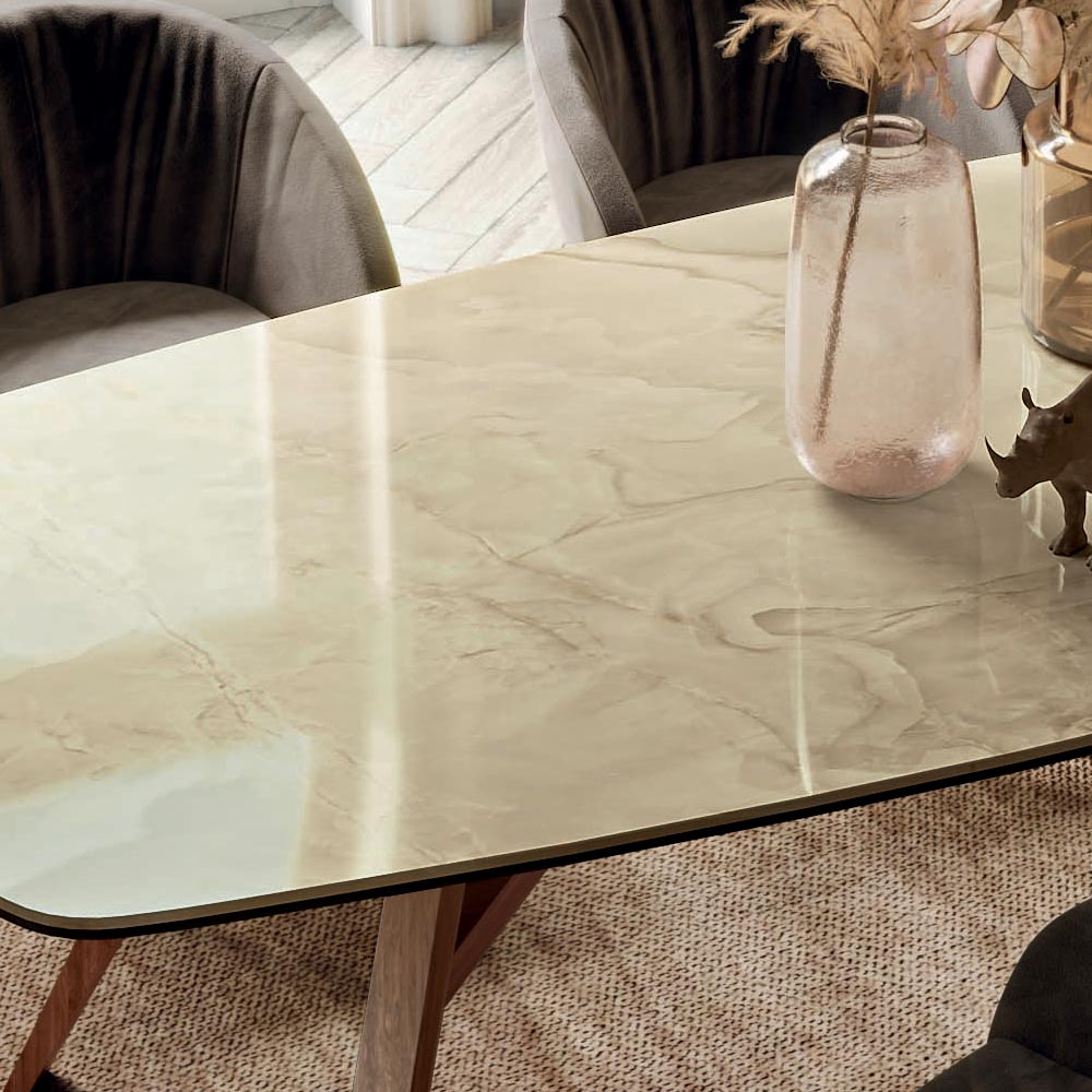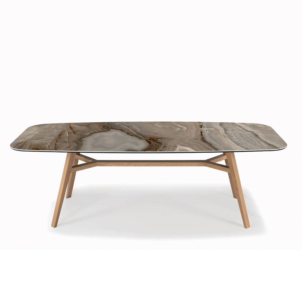 Fixed barrel-shaped living room table with ceramic top, 45° bevelled edge, ash wood base with Canaletto walnut finish . This product with a modern style has the primary objective of being able to be used daily without sacrificing design. The product chain, from conception to production, up to quality control, is carried out entirely in Italy , in order to guarantee and preserve the typical characteristic of Italian "know-how" and the importance of typical Made in Italy.
