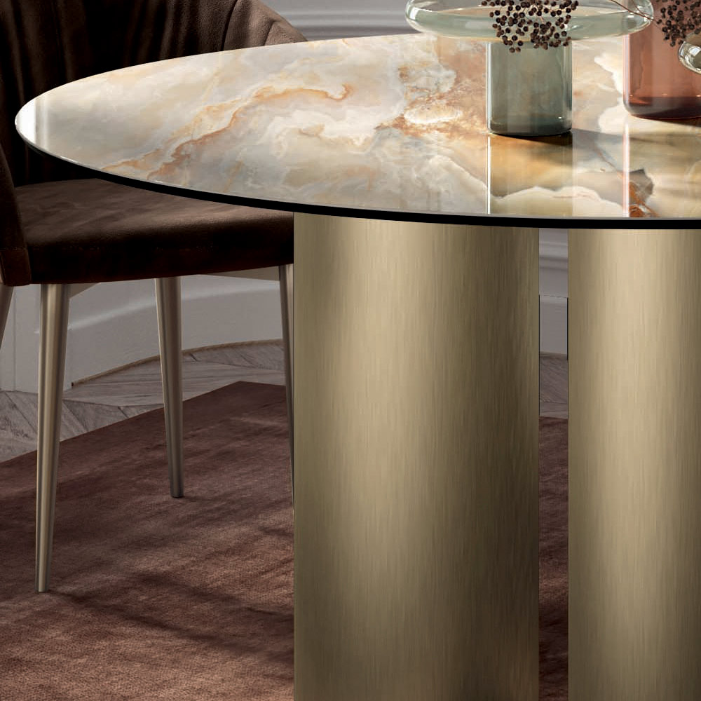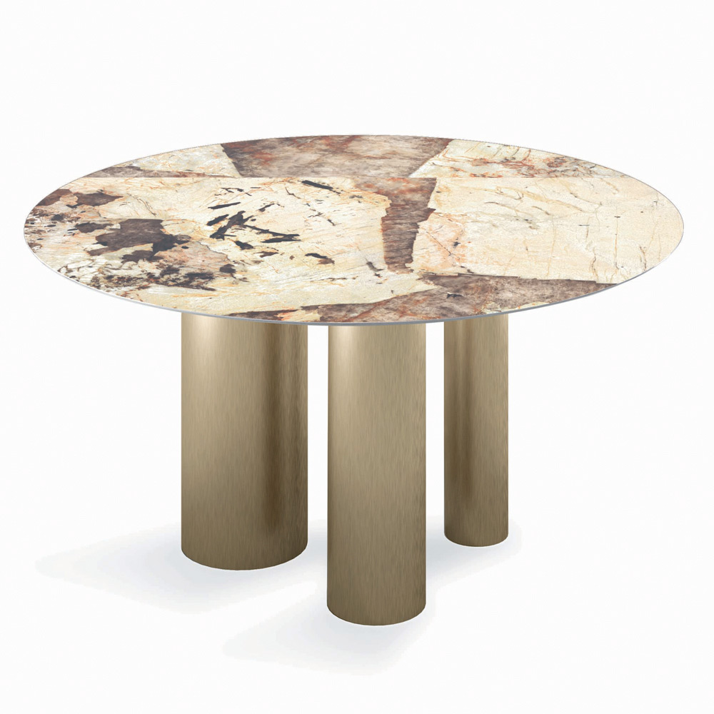 Round fixed living room table with ceramic top, 45° bevelled edge, champagne lacquered steel base and adjustable feet. The characteristic element of this product is the base made up of 3 cylinders of different sizes which give it a unique elegance and refinement . This table can complete and personalize any daily and contract environment, best responding to the most diverse design needs. It is made entirely in Italy by choosing top quality materials and paying attention to every single detail.