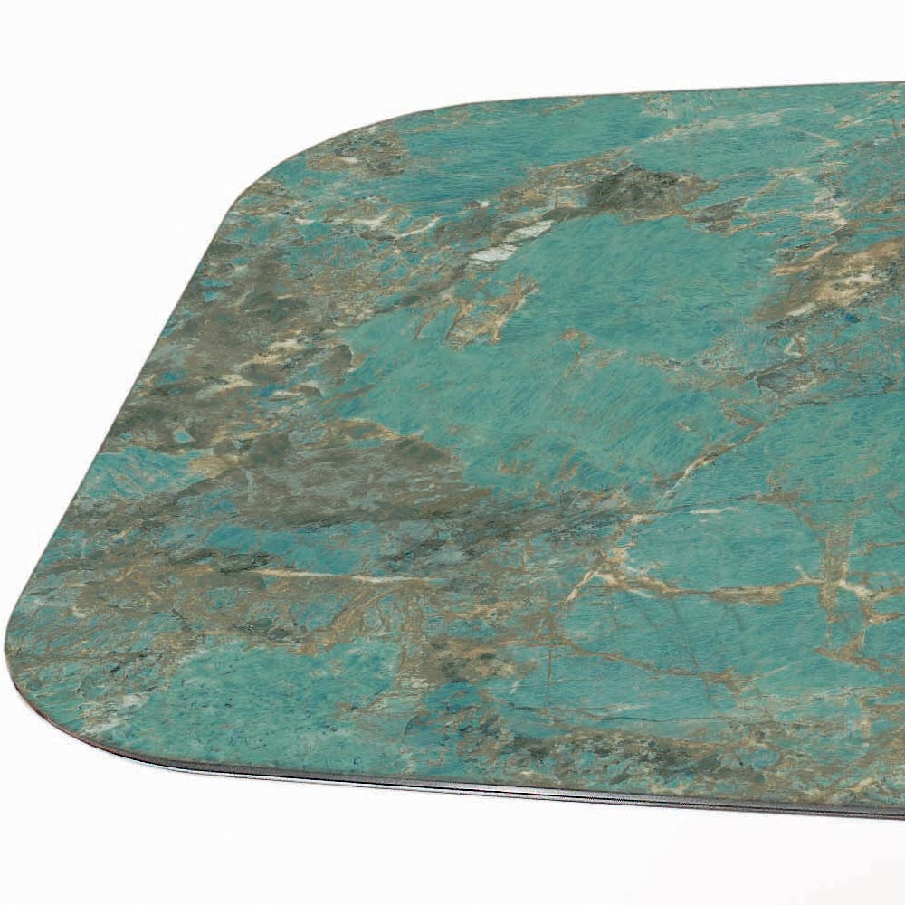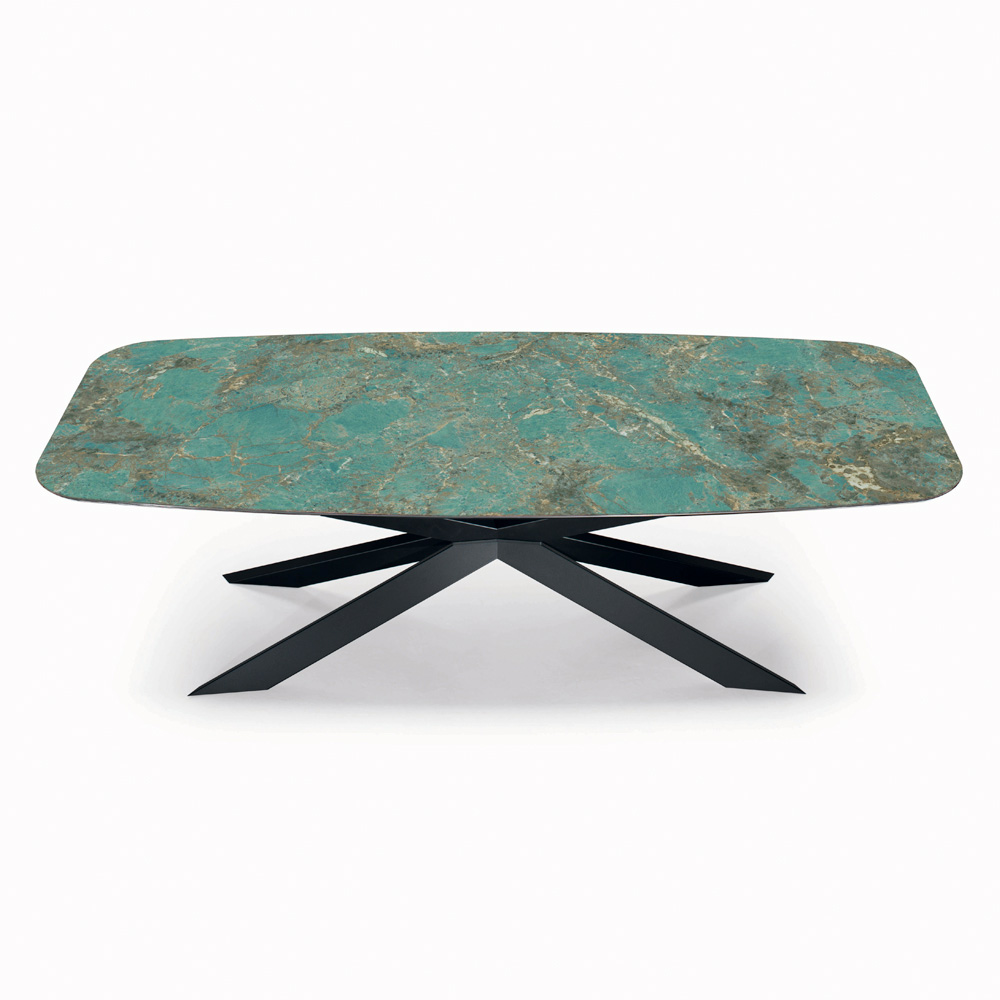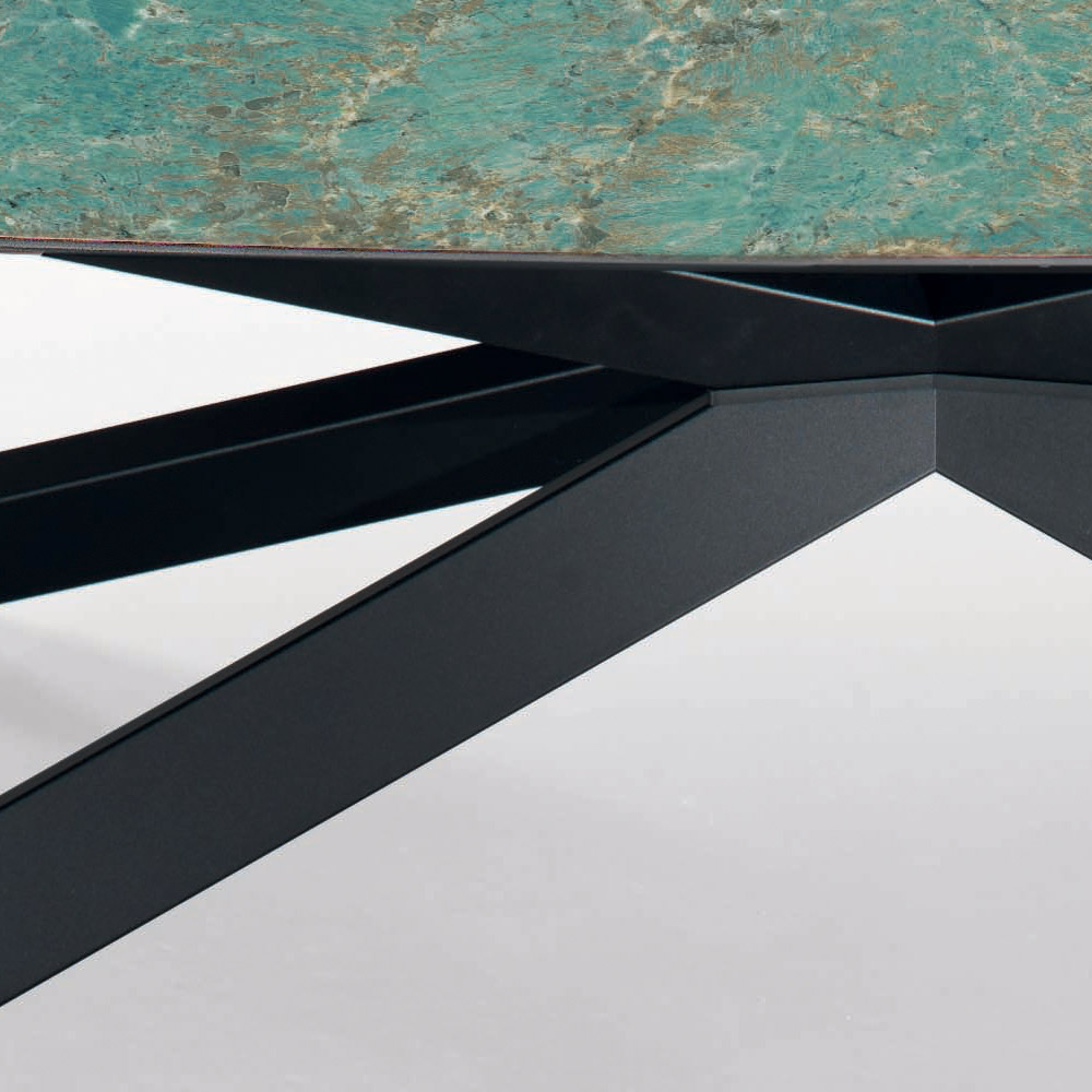 Fixed barrel-shaped living room table with polished amazonite finish ceramic top ,45° bevelled edge, black lacquered steel base with adjustable feet. All the mastery and quality of Italian artisans are contained in this product, where the best materials have been chosen and maximum attention has been paid to every single detail . We wanted to combine modern style with functionality to create a table that is not only beautiful to look at but also usable in different occasions.