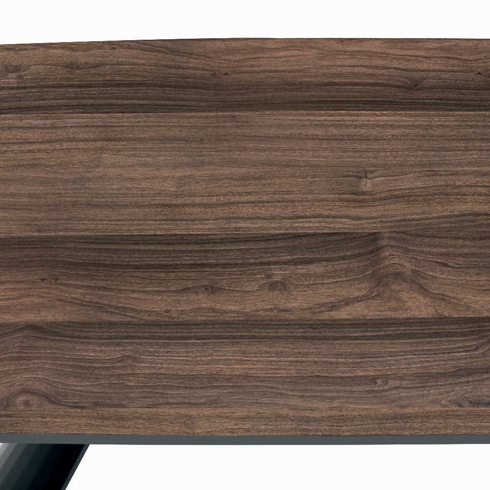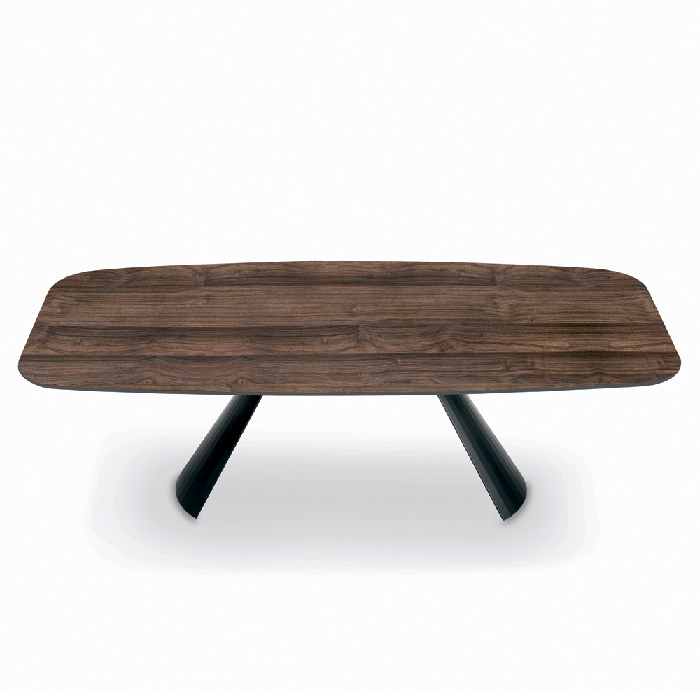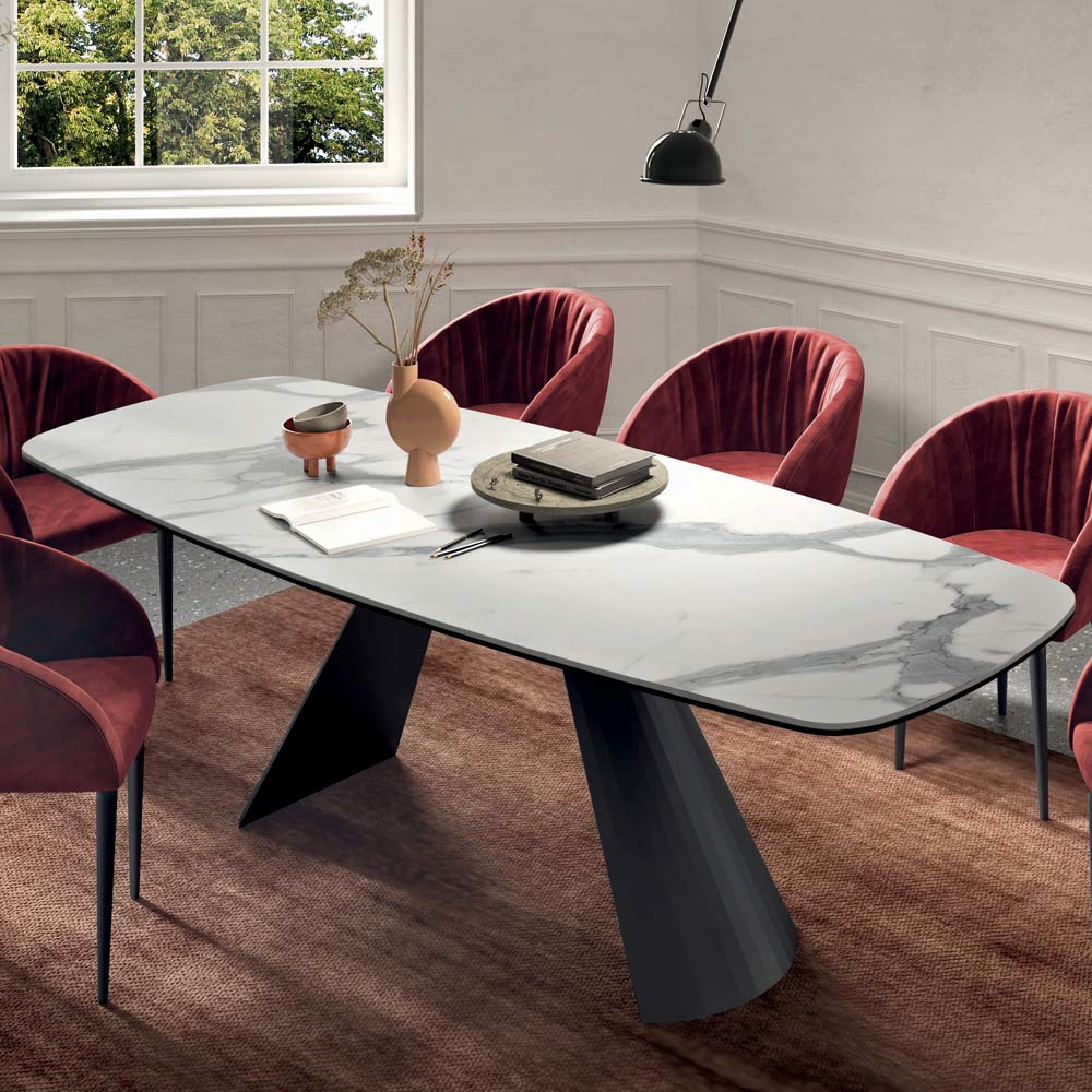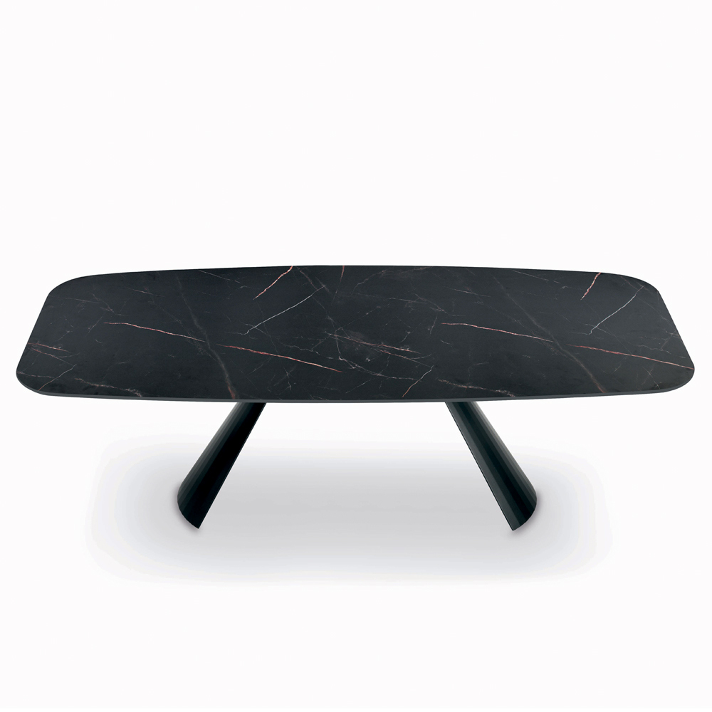 Fixed barrel-shaped living room table, with laminate top, 30° bevelled edge , black lacquered steel base and adjustable feet. The choice of top quality materials and the attention in the creation of every single detail create a product of excellent quality Made in Italy . Thanks to the shape of the base and the available finishes, this table is the protagonist of any daily contract environment , becoming a perfect idea for all those who want to give the room an elegant, sumptuous and unique touch.