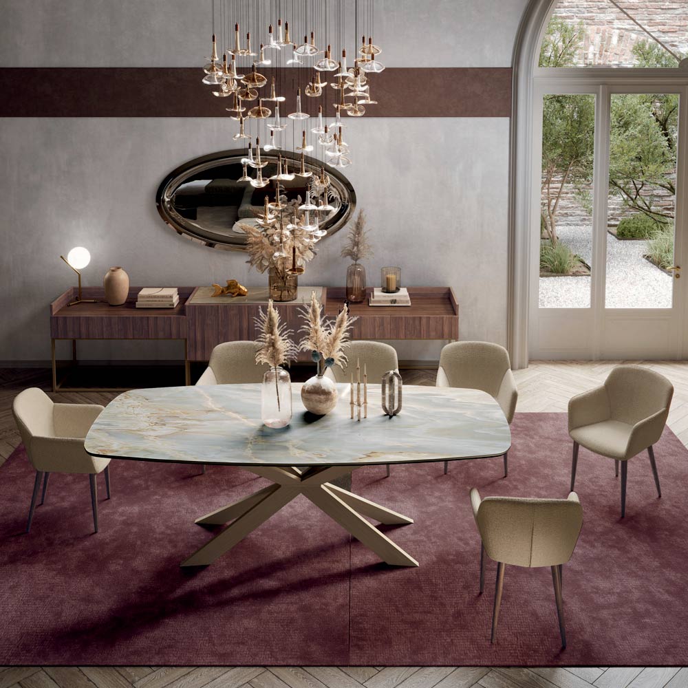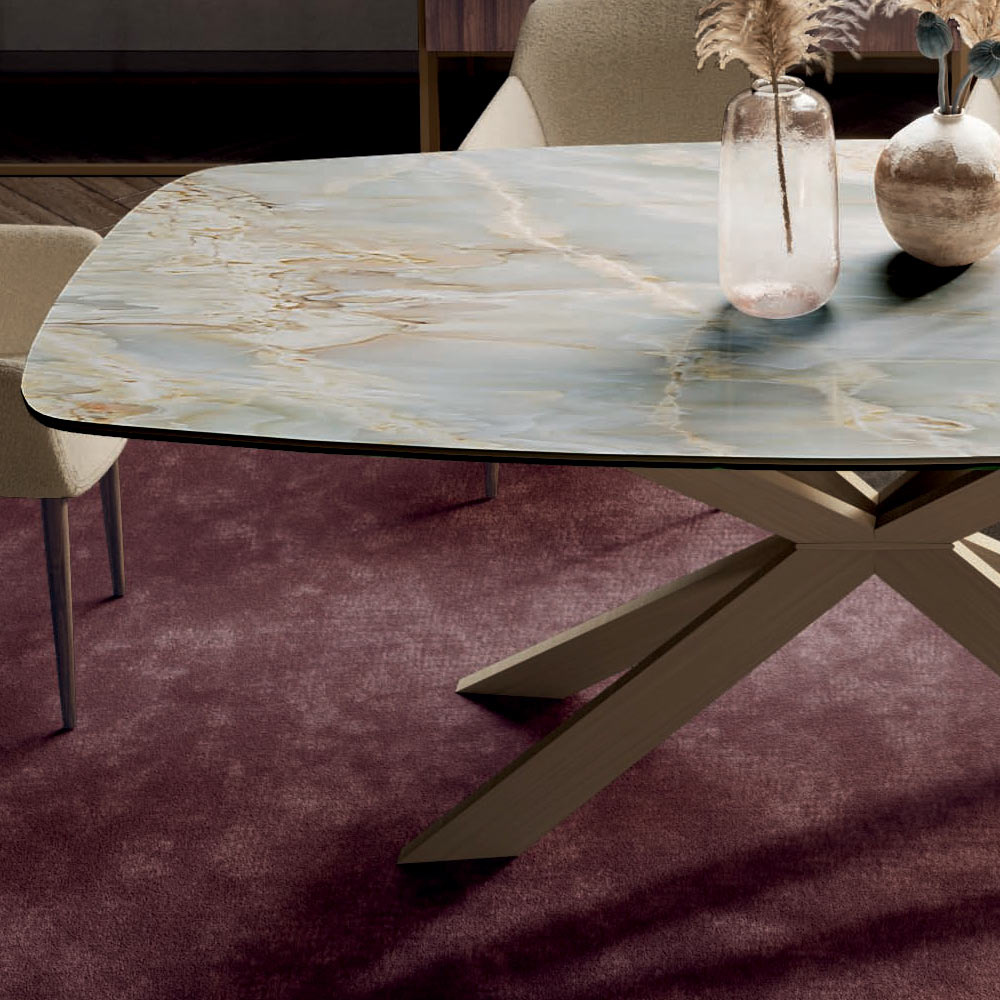 Fixed barrel-shaped living room table with ceramic top in shiny silver onyx finish,45° bevelled edge, champagne lacquered steel base with adjustable feet. All the mastery and quality of Italian artisans are contained in this product, where the best materials have been chosen and maximum attention has been paid to every single detail . We wanted to combine modern style with functionality to create a table that is not only beautiful to look at but also usable in different occasions.