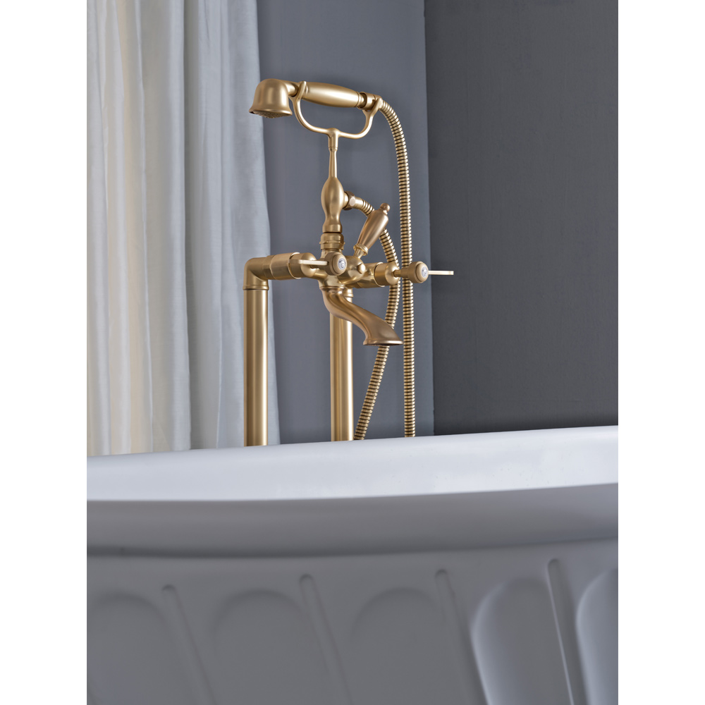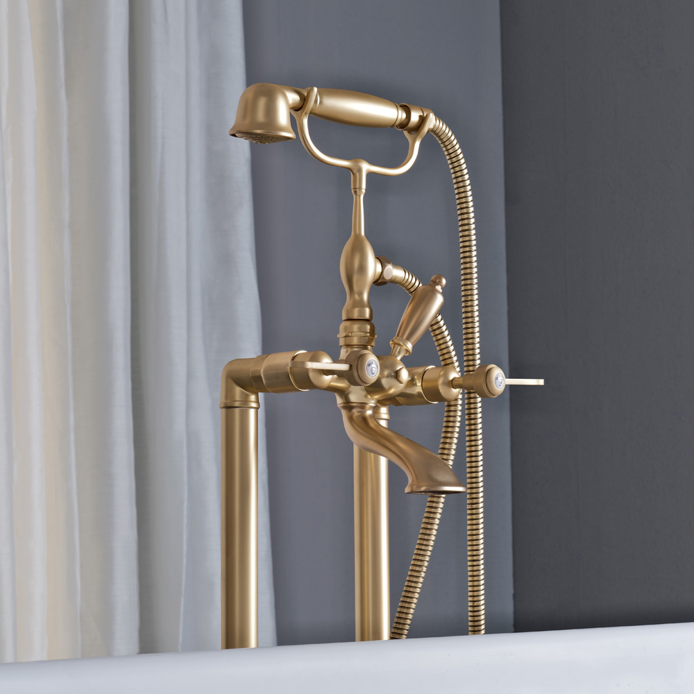 Floor-mounted bathtub assembly with hand shower and flexible, made of heavy brass, cast in molds that respect the craft systems of the past and protected with a thick layer of finishmatt brass.