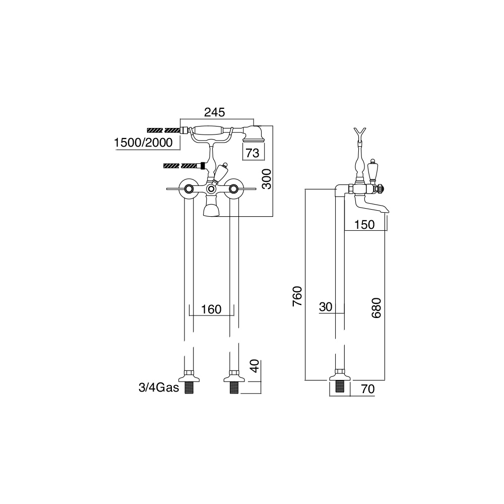 Height of knobs with hand shower 30cm