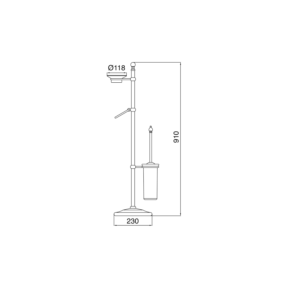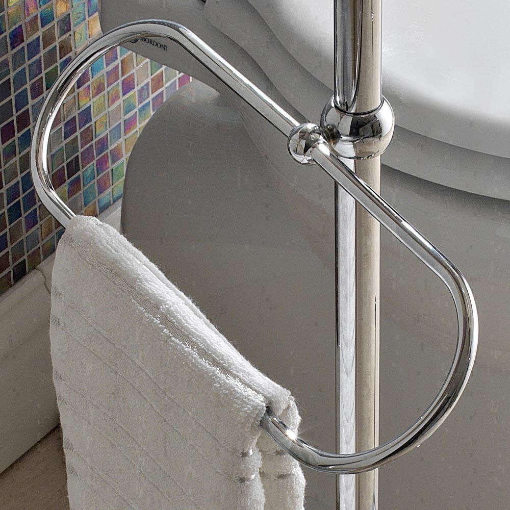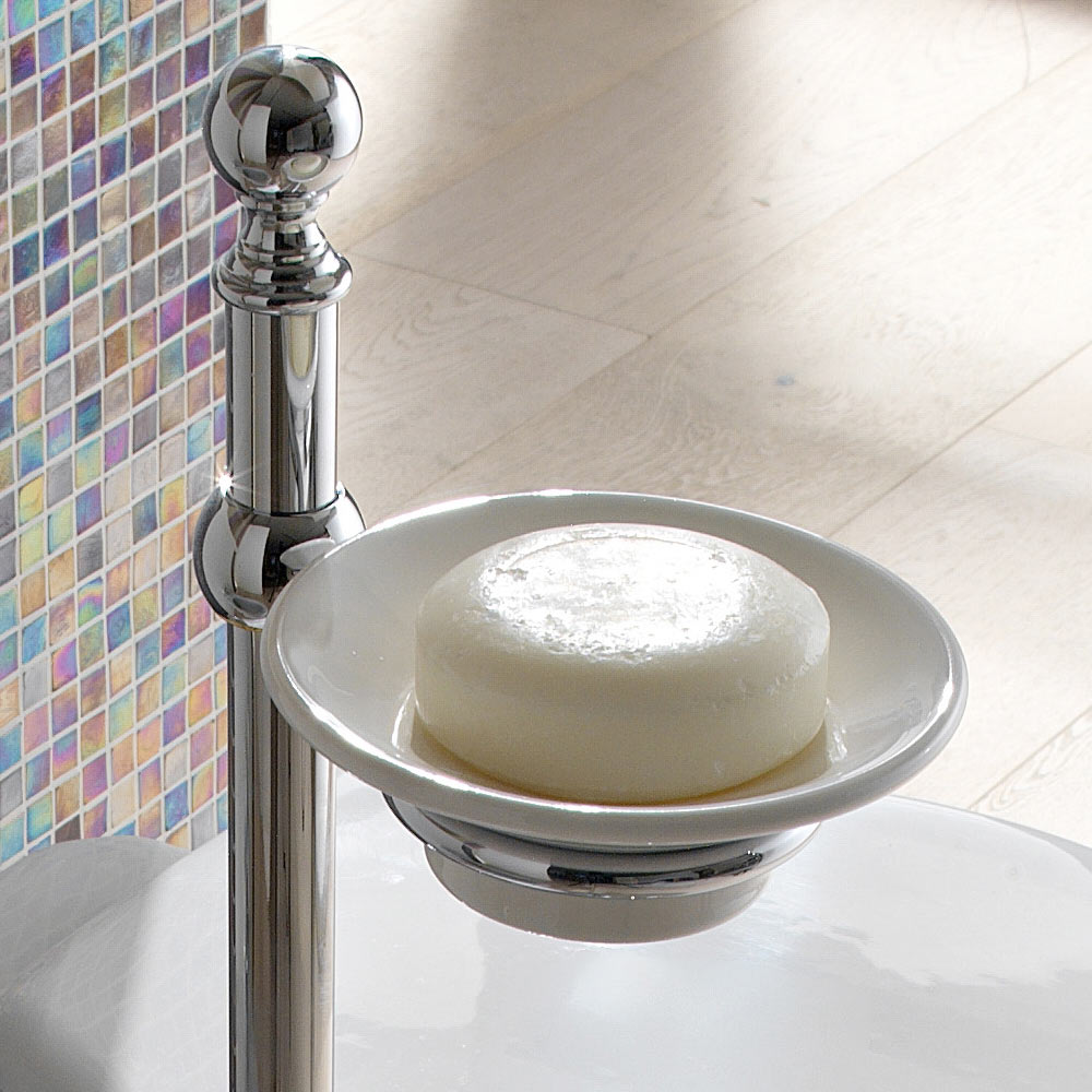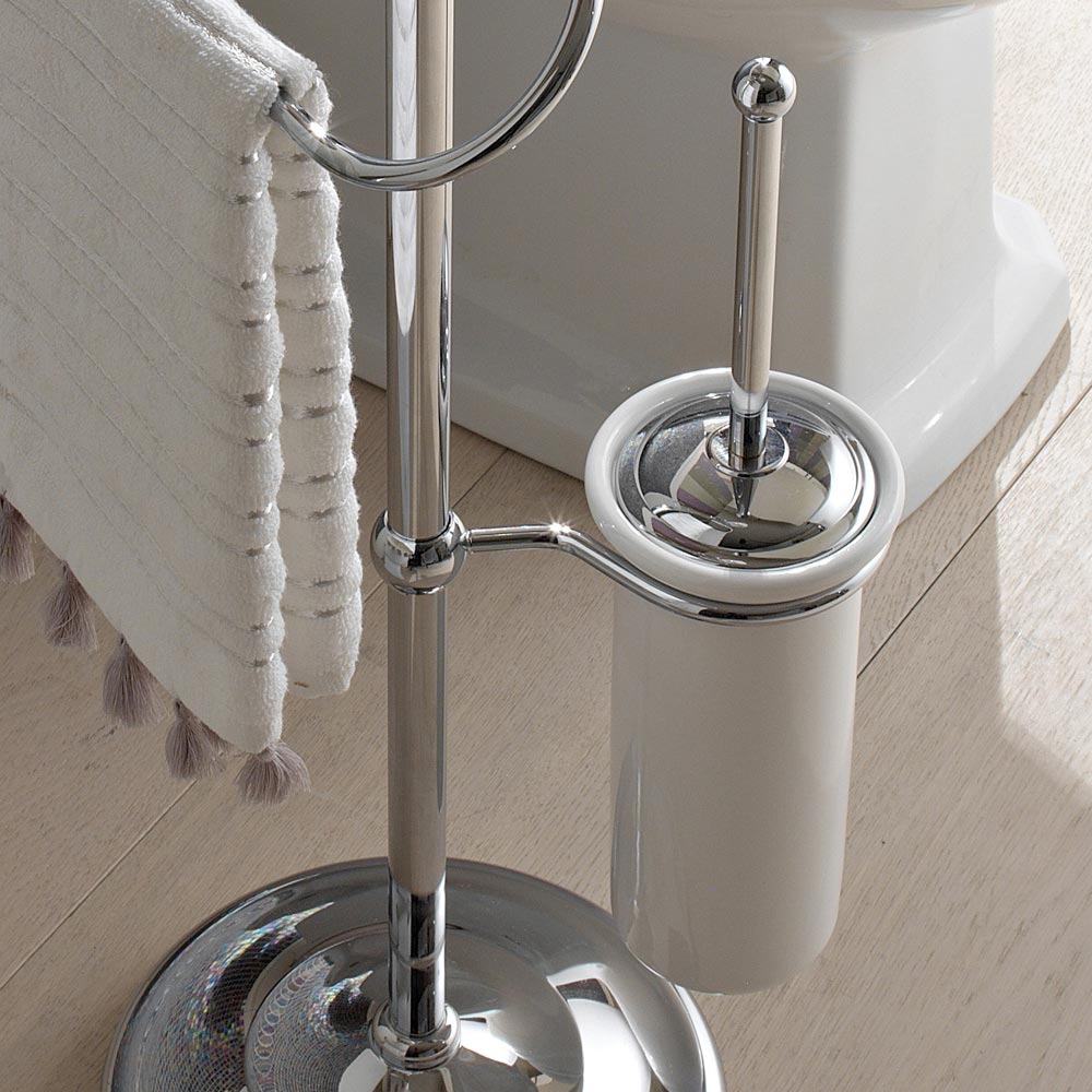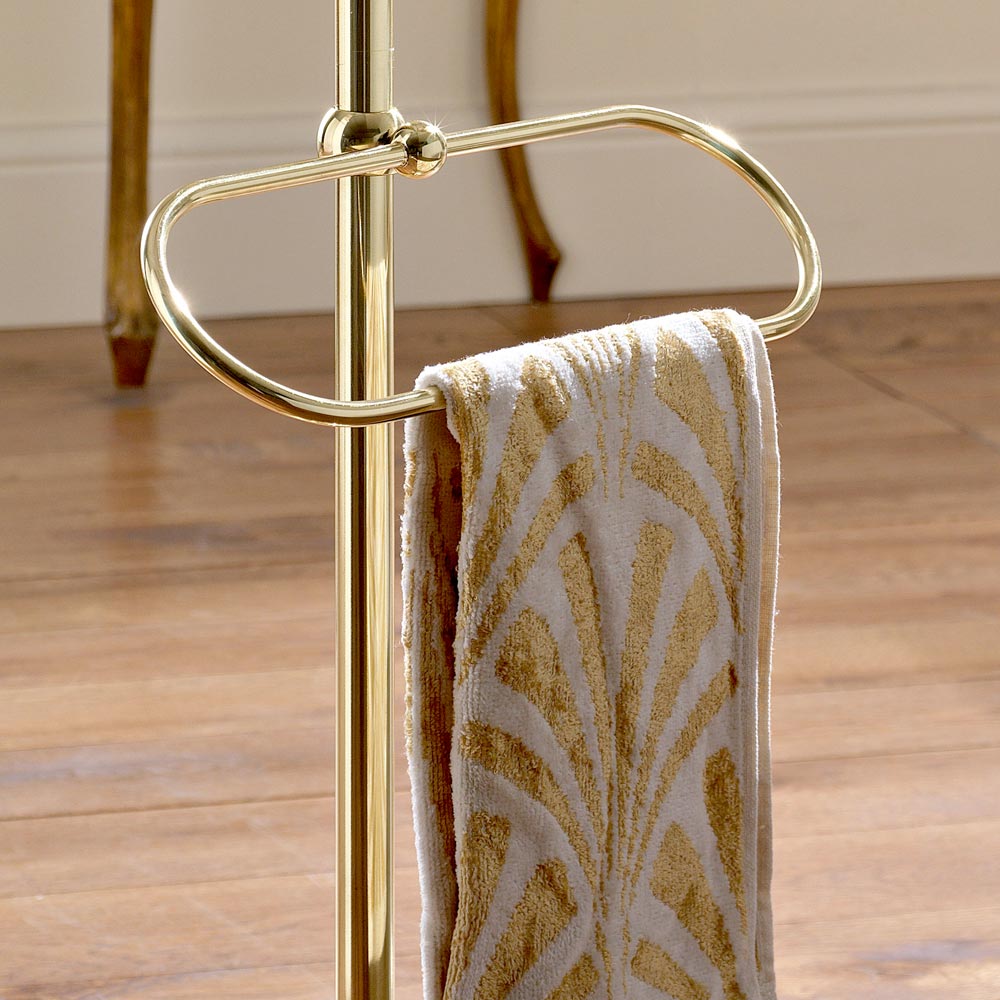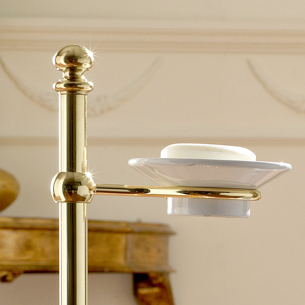 Floor towel holder with soap dish in brass and ceramic produced in Italy, Rouen.