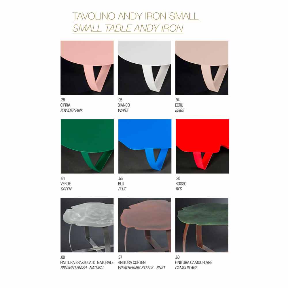 Andy is a sturdy coffee table, characterised by an original and modern design. This special coffee table is made from laser cut metal, with curved legs. The legs are painted in the same colour of the top, except for the camouflage version. The epoxy coating is available in different colour shades.
