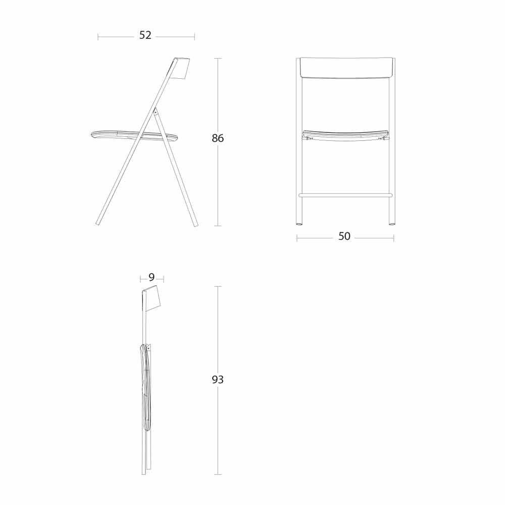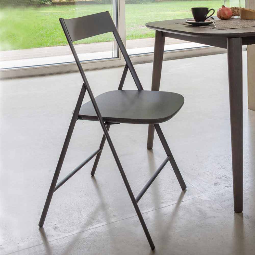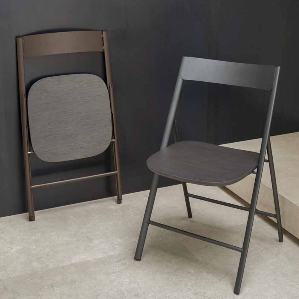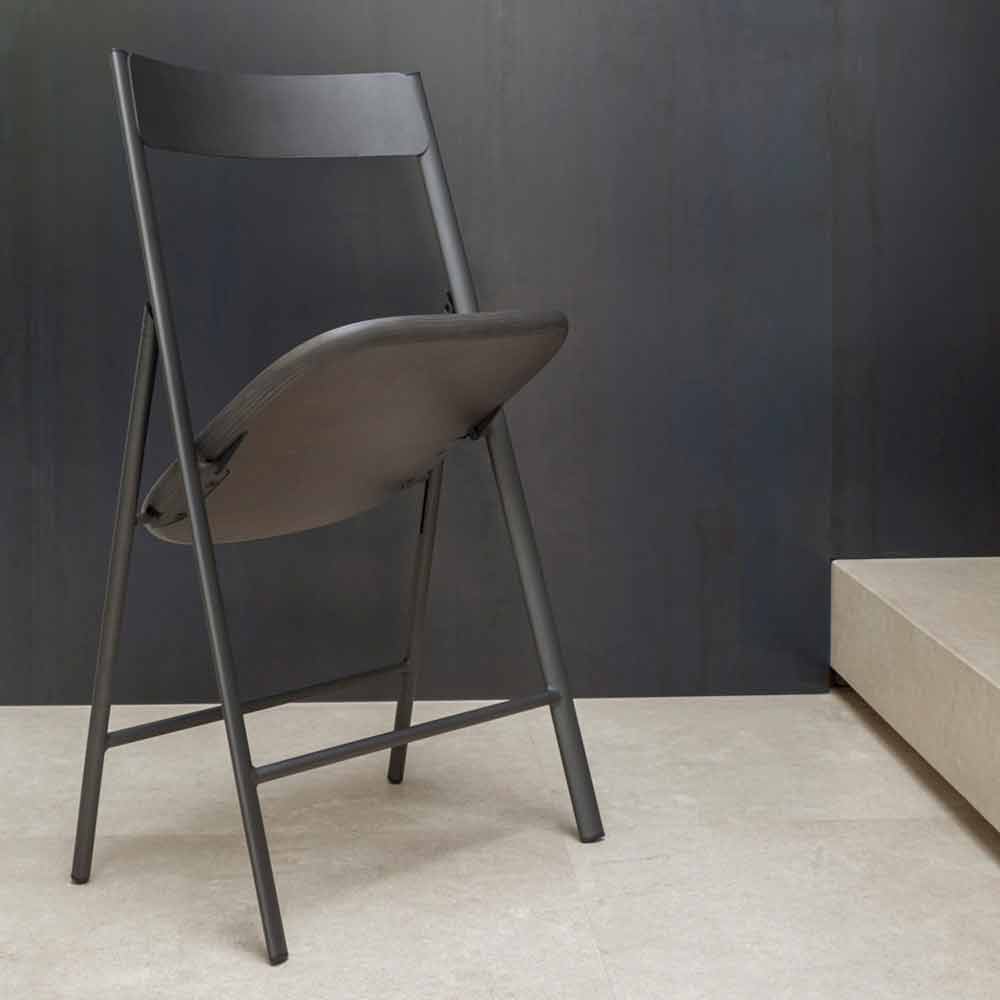 This comfortable chair is characterized by its simple and minimal design, classically inspired, functional and foldable to maximize space and use it according to need. Thanks to its essentiality, it can be combined with different furnishing contexts by virtue of a sober and refined design. The structure and the backrest are made of painted metal while the seat is in veneered oak wood , as well as a chipboard panel which is covered with a very thin sheet of wood.