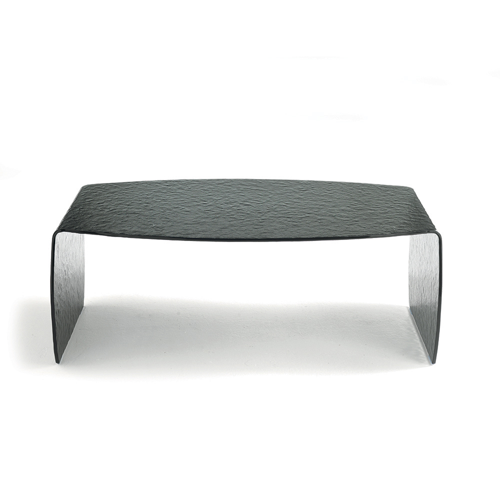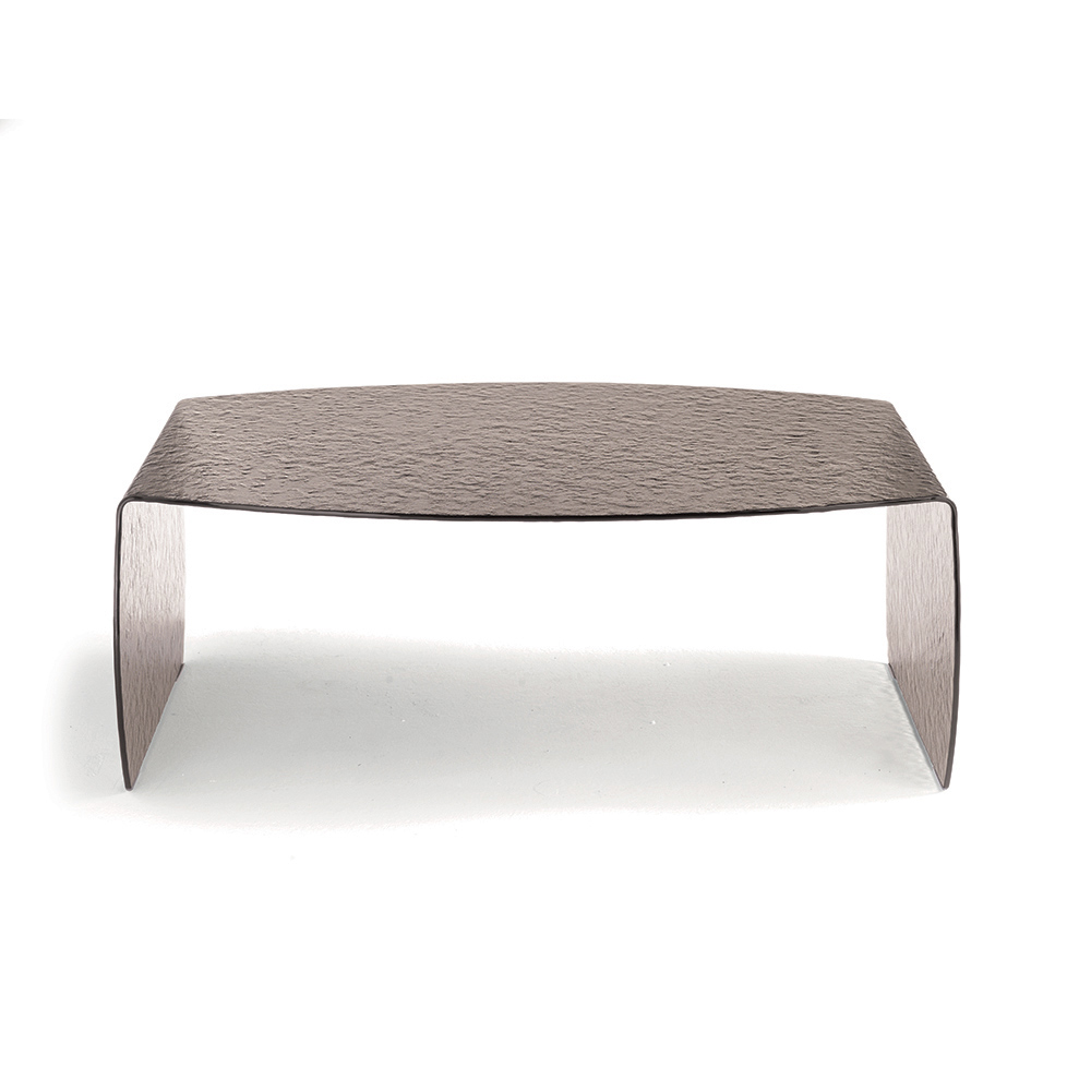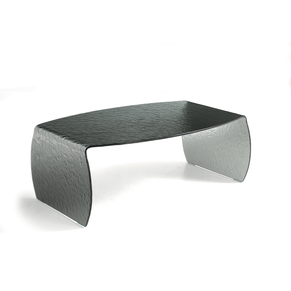 Crafted from a single sheet of curved clear glass , this coffee table features a hammered finish that adds depth and creates an elegant play of reflections. The glass's texture enhances natural light, making the room brighter and more airy.