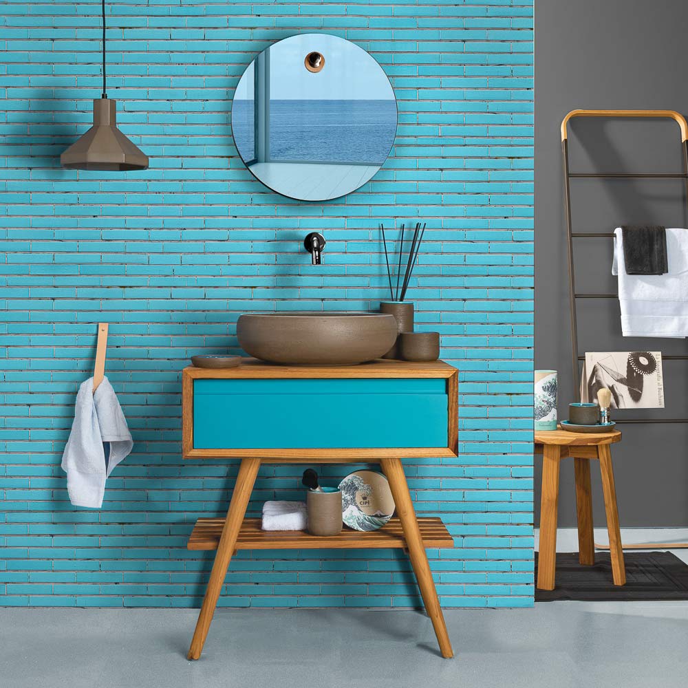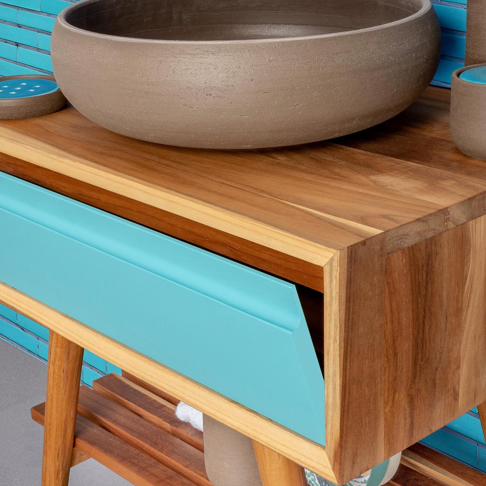 Floor-standing bathroom cabinet made of naturalrecovered teak with flap drawer in bluemahogany wood , a color that refers to the calm and serenity associated with natural elements such as water and air offering relaxing effects, emotions that refer to charm domineering of nature. Its structure is characterized by simple shapes and practical spaces ideal for organizing the bathroom area in an elegant and functional way for an original result with a strong modern personality .