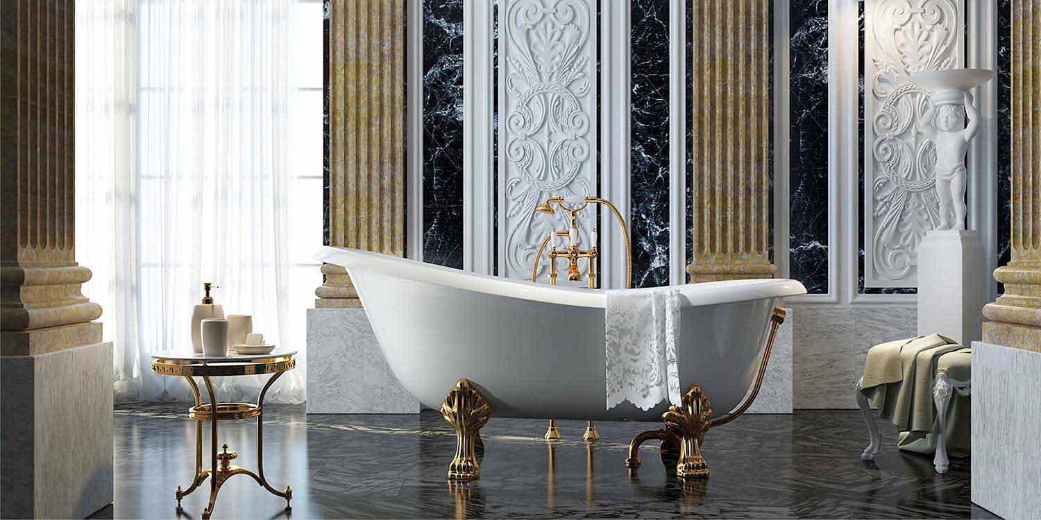 Fregona comes in white reinforced resin with gold-colored metal feet; its freestanding installation and its classic and decisive design combined with ancient and careful lines will be the perfect mix to illuminate your bathroom.
