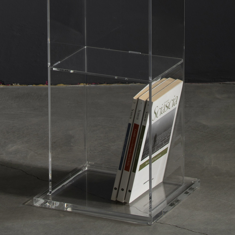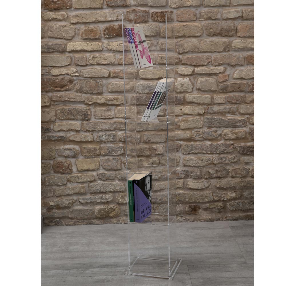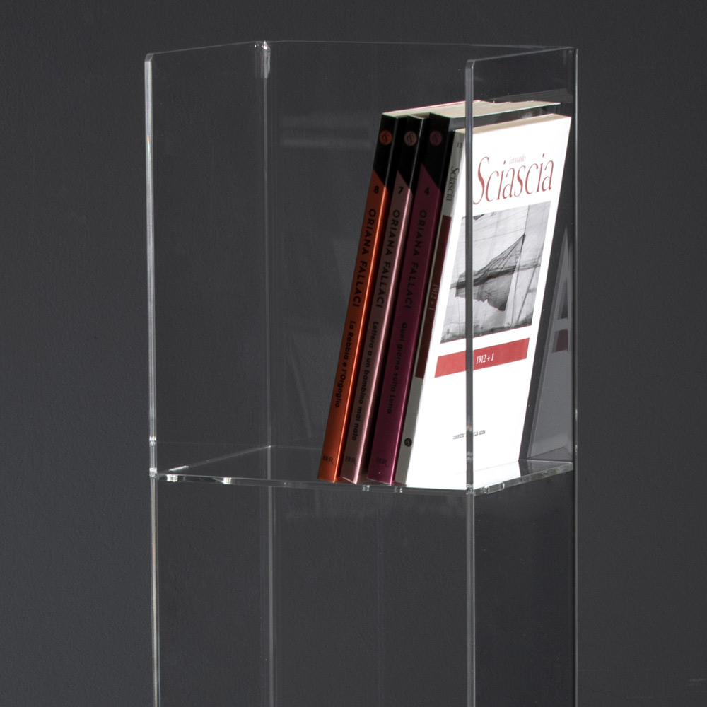This freestandingbookcase is a piece of furniture entirely made of transparent acrylic crystal with a 5 mm thick column structure and 4 mm shelves. Its clean and minimal design adapts to classic and modern environments. The acrylic crystal is the methacrylate polymer that is characterized by the purity of its transparency that surpasses natural crystal.