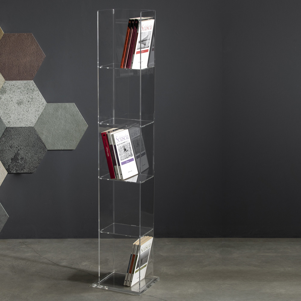 Freestanding bookcase in transparent acrylic crystal, design made in Italy.