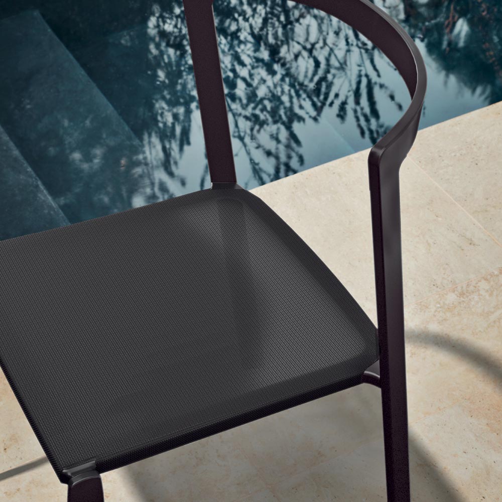 Garden chair composed of a painted aluminum structure and seat covered in colored textilene, made in Italy . The combination of sinuous lines and soft shapes creates a wonderful visual effect capable of enhancing both the external and internal space.