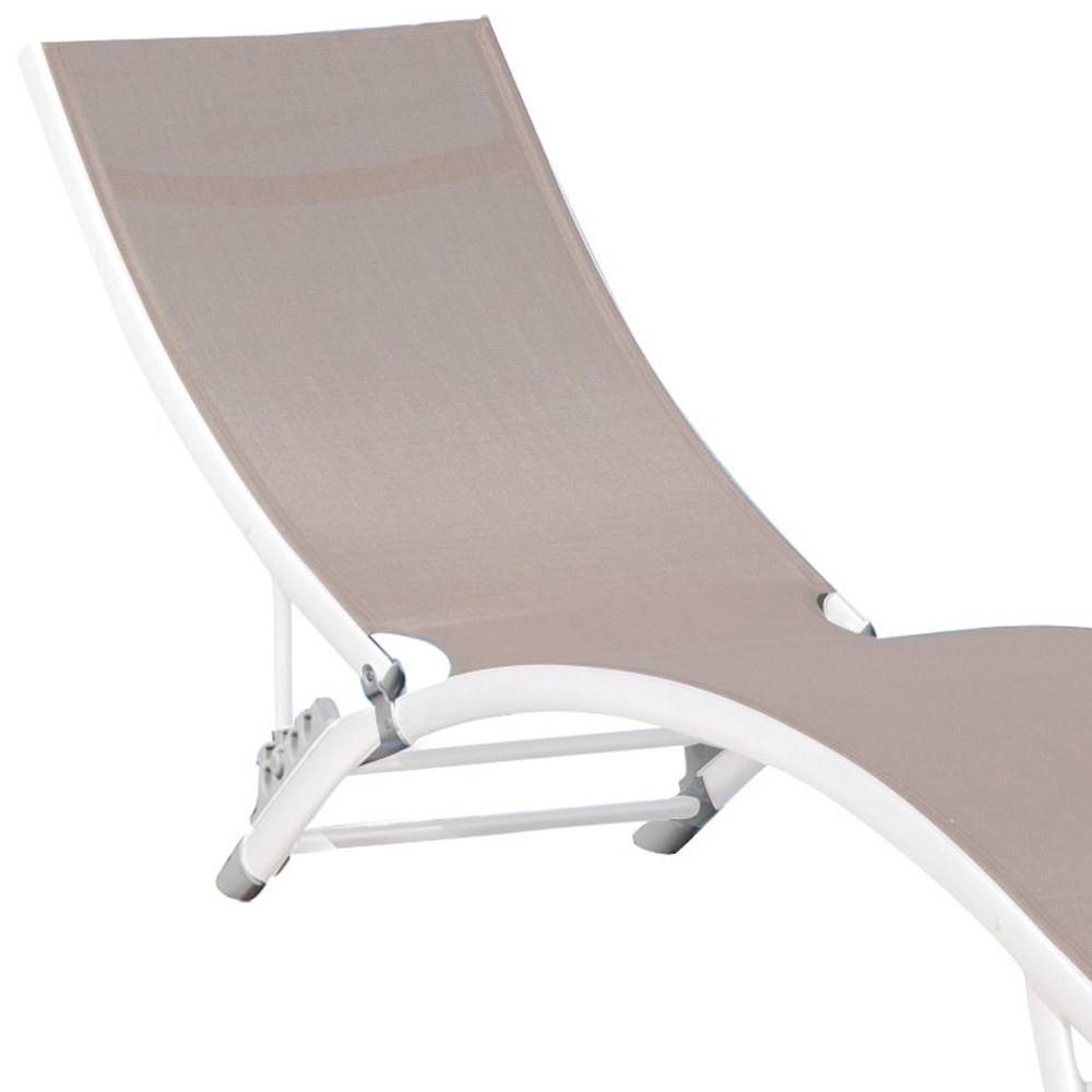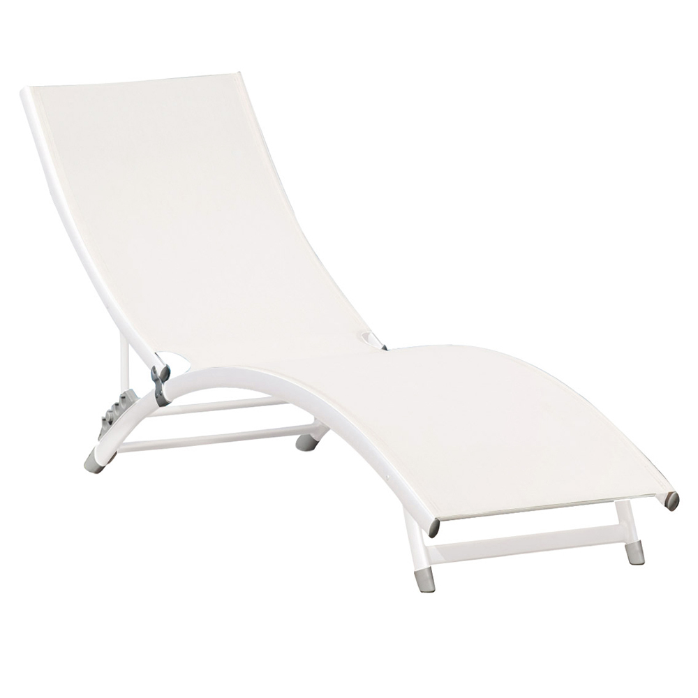 Stackable garden chaise longue with structure made of white aluminum with 40 x 20 mm tube and seat in 600 gr textilene. An elegant and functional design marked by essential lines that make it perfect for outdoor contexts such as beaches, seaside resorts and exclusive tourist resorts but also domestic spaces such as gardens and poolsides.