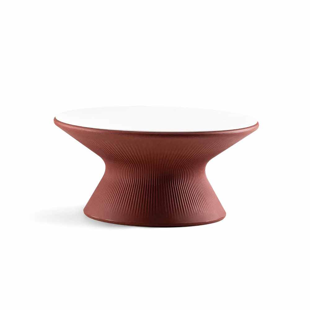 Outdoor coffee table with structure in polyethylene and round top in white HPL made in Italy. What characterizes this modern complement for outdoor furniture is the particular striped surface that covers the entire base, bringing to mind the finish of natural materials. Simple and with a versatile design, it is an ideal solution to enrich both domestic and contract outdoor environments with personality and an original touch, in which it completes the furniture while at the same time representing a practical table top and a real design object.