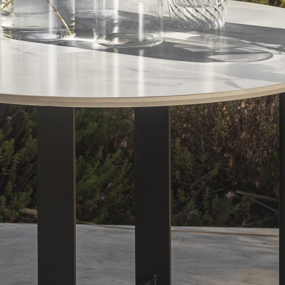 The outdoor coffee table with black painted steel structure and white marble effect porcelain stoneware top is made in Italy with materials that can guarantee excellent resistance and stability. The unmistakable and avant-garde design that underlines the round shape of this coffee table is able to create at the same time a strong scenic impact, useful when you want to light up outdoor spaces that need a furnishing solution with a strong personality.