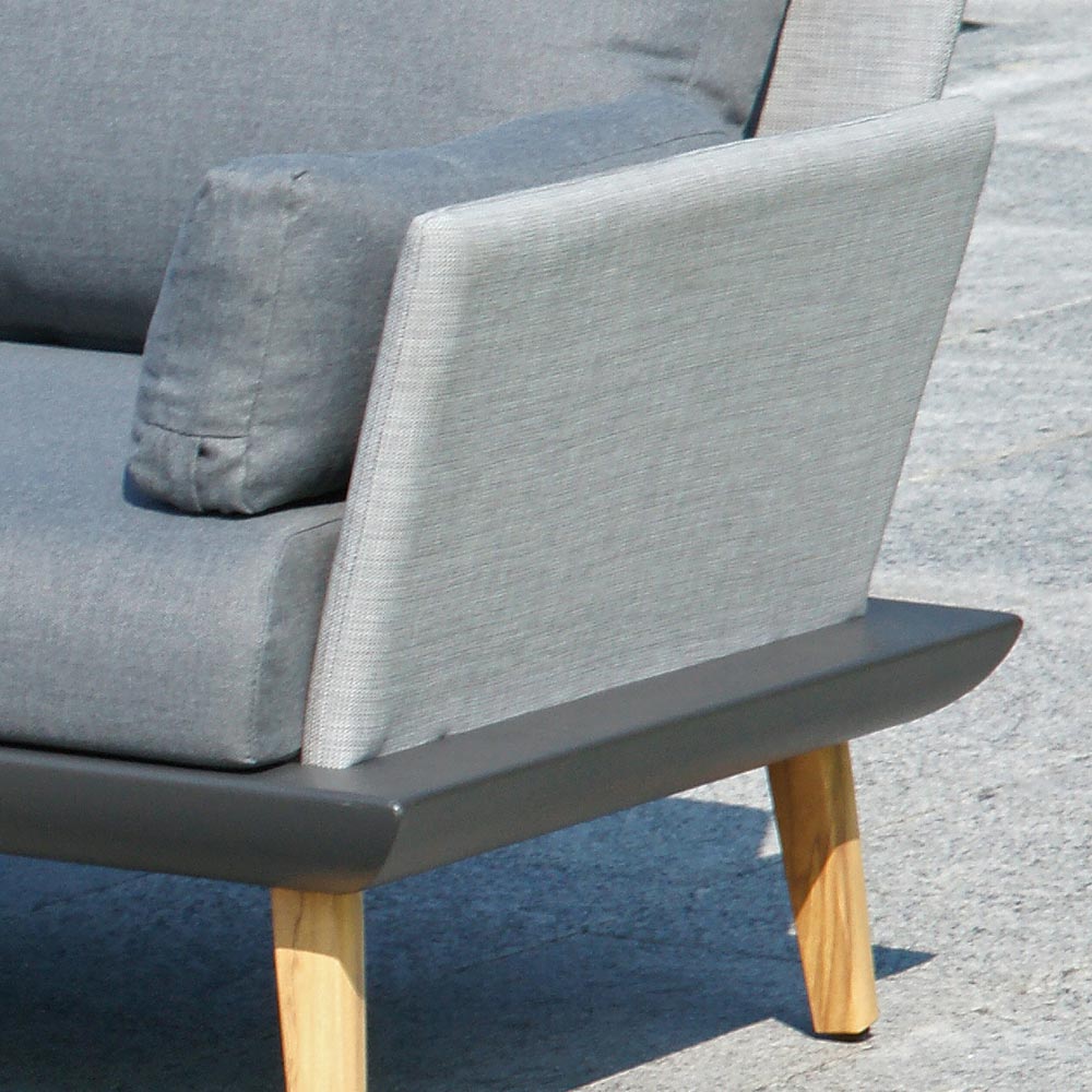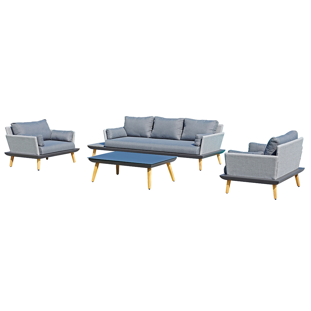 Outdoor lounge consisting of 2 armchairs and a 3-seater sofa equipped with a practical side table with resinwood top covered in light gray textilene , anthracite gray aluminum structure and wood-effect aluminum legs complete with removable gray polyester cushions . The composition also includes a coffee table with frosted tempered glass top and aluminum structure in the same color as the other elements of the living room.