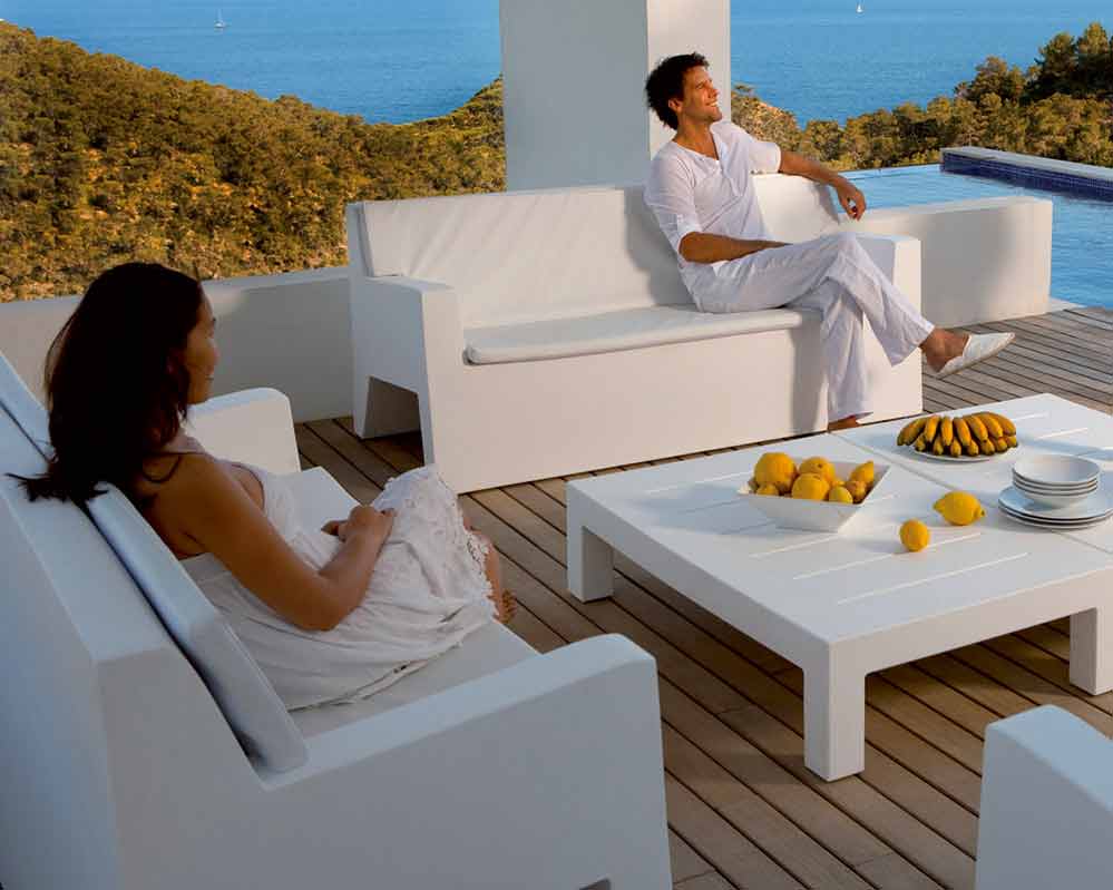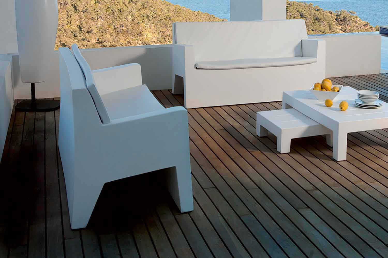 The Jut by Vondom collection is designed for both outdoor and indoor spaces. Lines with pure and rectilinear shapes, reflect the mineral inspiration and refinement of their technique that creates unprecedented products for outdoor furniture. Ergonomics, functionality and ecology are other key features of the Jut. The innovative and recyclable material takes care of the maximum demands of the market to guarantee a long-lasting use in support of the most extreme atmospheric conditions maintaining their colors throughout their life.