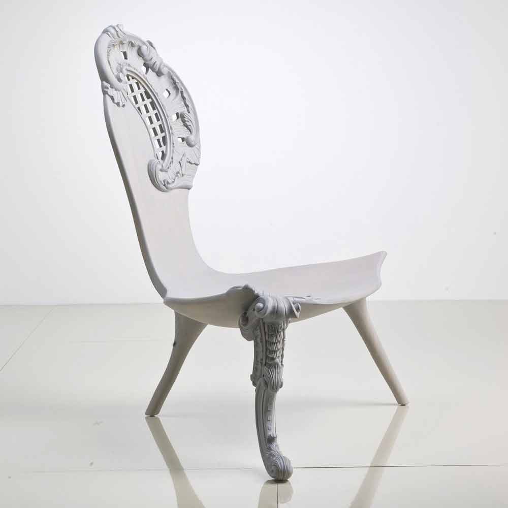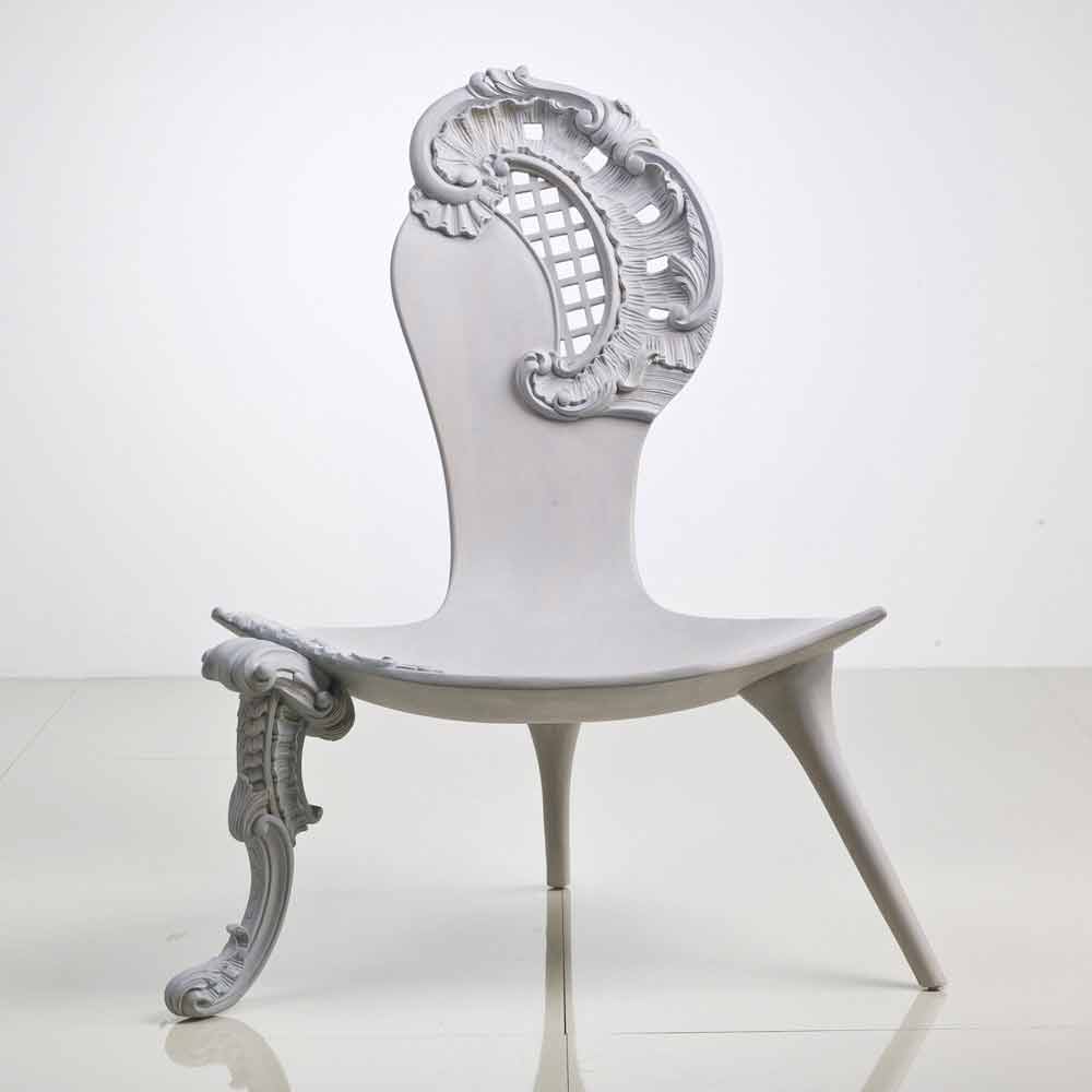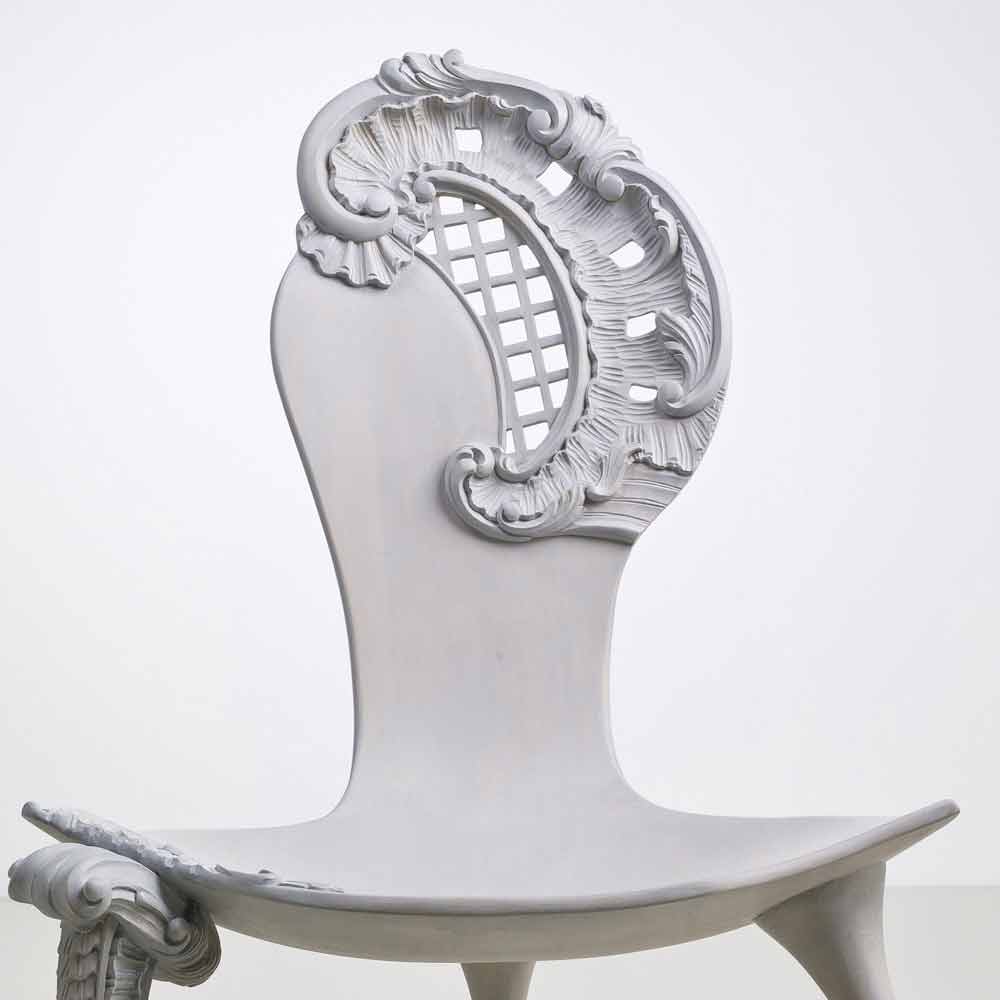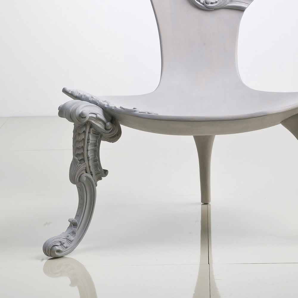 Hand carved throne in solid oak, gray design, Leon Leon is a hand carved throne in solid wood with a baroque decoration back and solid wood seat. A smooth wooden sheet outlines the soft profile in some of its parts evolves into a flourishing baroque work. Almost as if the wood slowly took life, on the armchair grows a sort of floral hat with a lot of veil, while the leg is enriched with convoluted wooden curls. Gray oak finish (smoke gray).