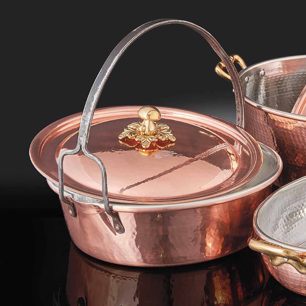 Round copper casserole with lid and arched handle, made in Italy craftsmanship.