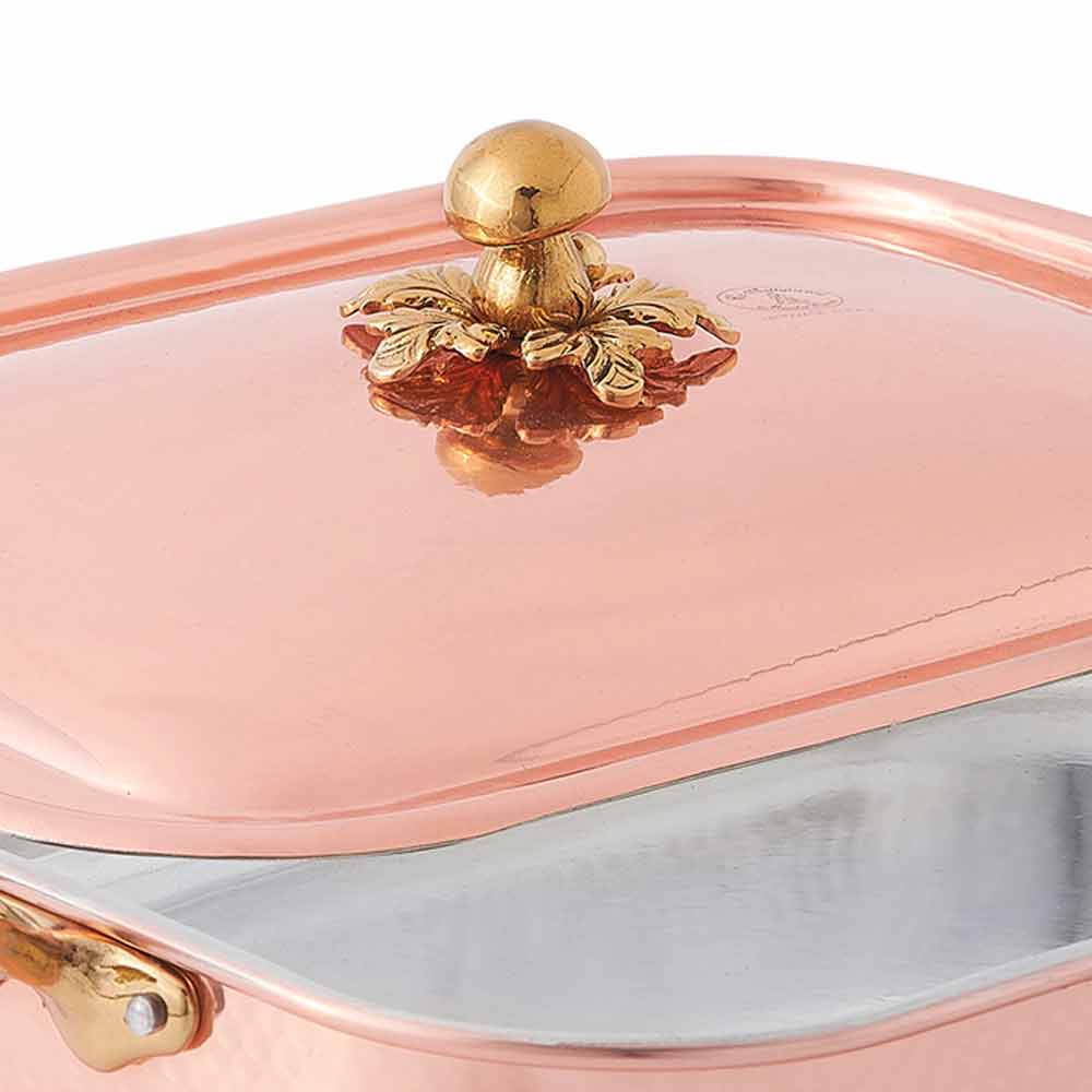 Rectangular roaster with copper lid and brass handles, made in Italy craftsmanship.