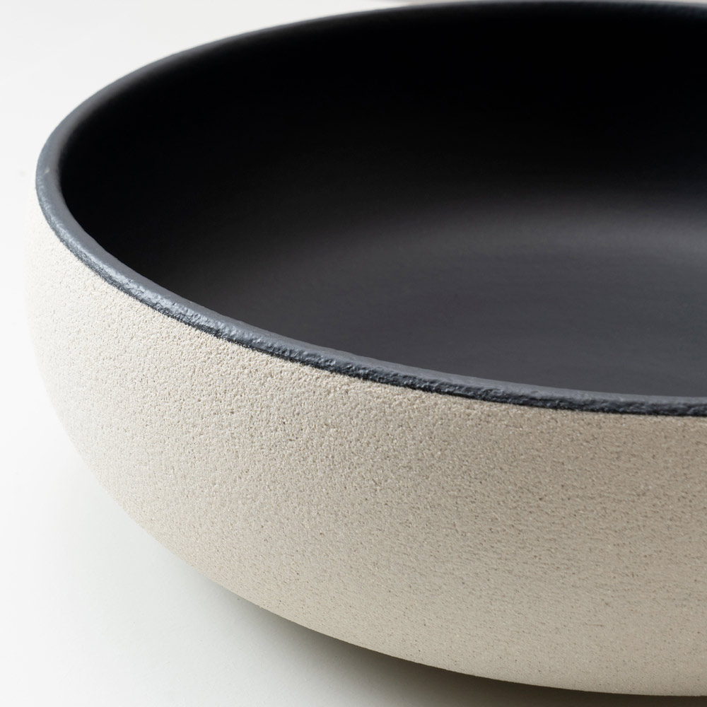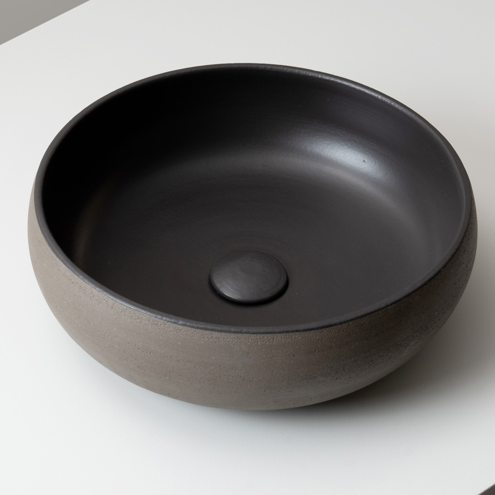 The countertop washbasin is crafted from light or dark Raku clay and hand-turned , following a ceramic tradition that showcases the material in its most authentic form. A washbasin with a simple, primordial design, characterized by harmonious proportions and elegant textured surfaces.