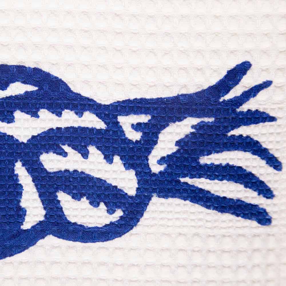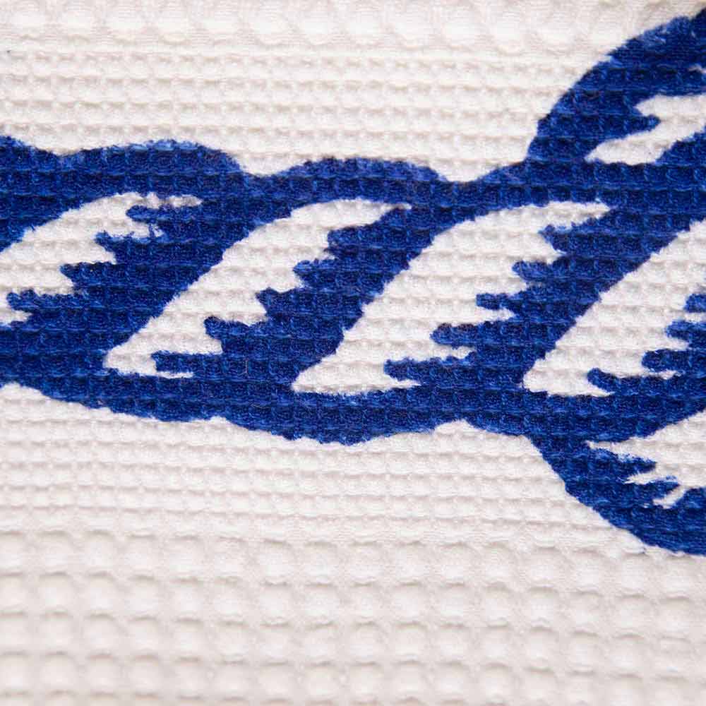 Highly crafted bath towel, hand-printed blue on white cotton with an ancient maritime rope drawing with knot, an exclusive piece of high quality, Made in Italy.