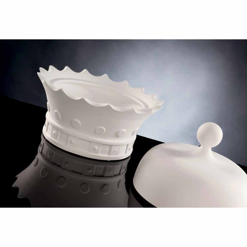 Decorative statuette in the shape of a king's crown with opening, made in Italy in white hand-made ceramic. An eccentric and elegant ornament at the same time capable of completing the surrounding furnishings by creating a wonderful harmony that embodies modernity and design . Its original and creative shape is ideal for those who love to enrich their domestic spaces with elements characterized by an original and unique soul while offering a small space in which to cram and organize some objects thanks to the practical compartment positioned under the lid.