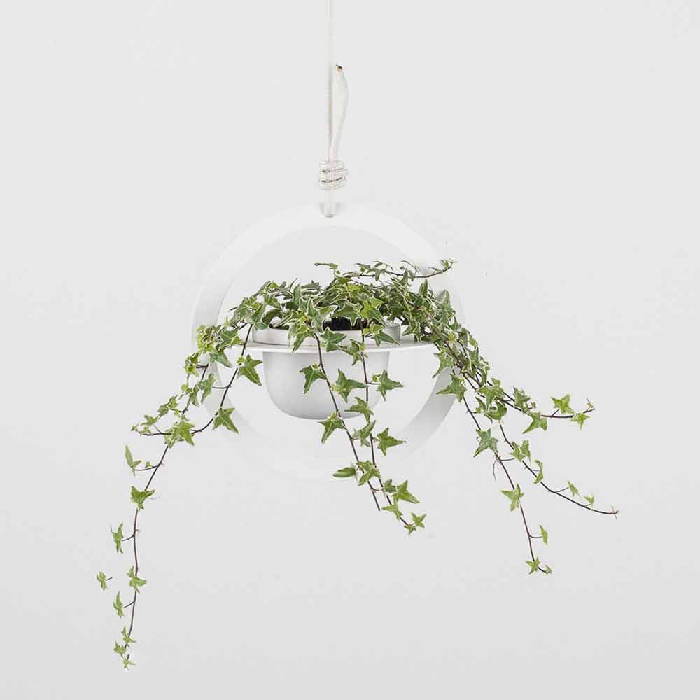 Hanging plant pot with a modern and refined design. Entirely made in Italy , this product has a structure composed of two RAL painted steel circles inside which there is an elegant white ceramic vase. The whole is supported by a solid and sturdy white nautical rope . Thanks to its three-dimensional lines and unusual shape, this pot transforms the environment by creating modern and contemporary atmospheres.