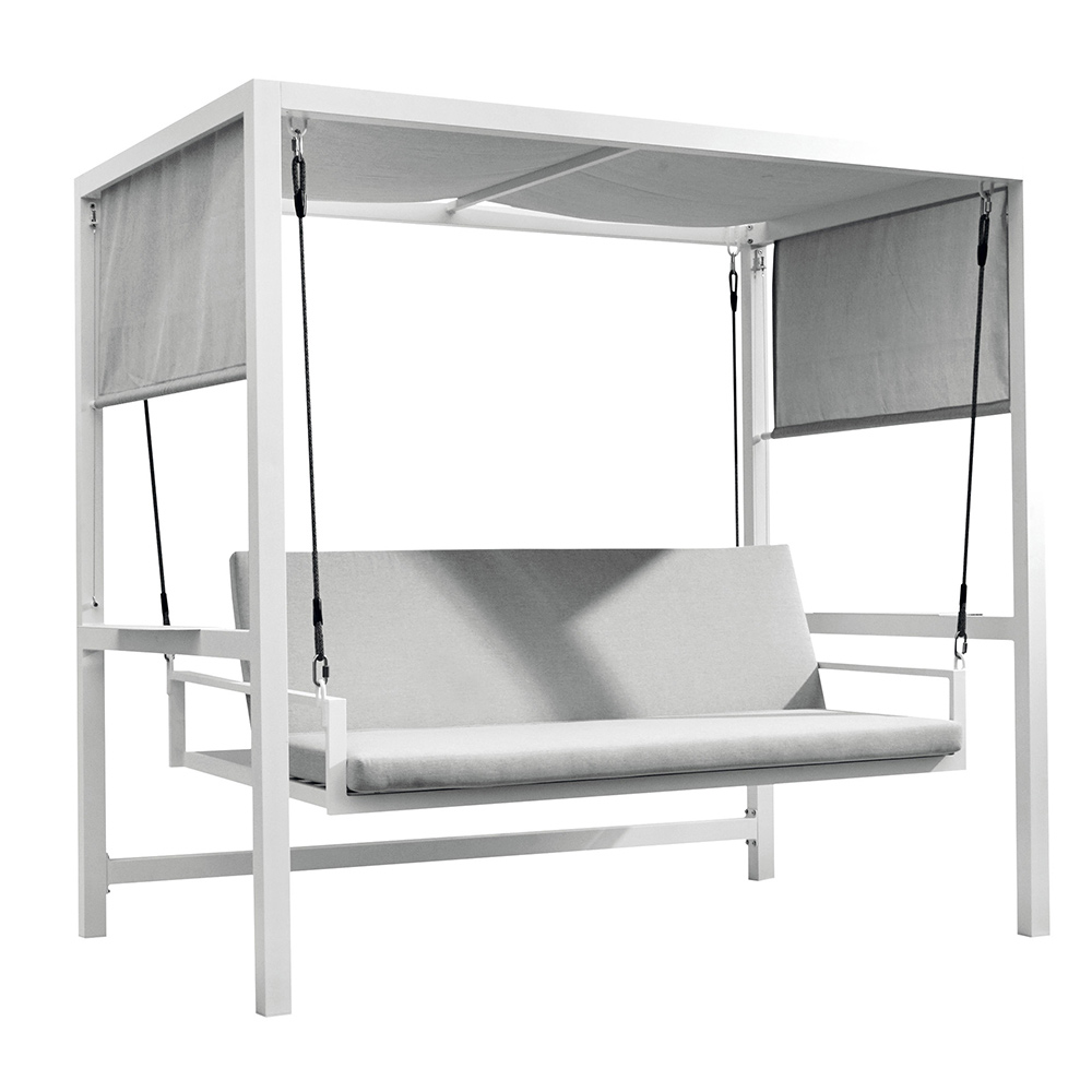 Garden swing made of white paintedaluminum with 190 gr olefin fabric cushions in light gray color. This outdoor swing is equipped with a reclining backrest which makes it ideal for creating a relaxing atmosphere and enjoying your free time outdoors. The outdoor swing features rigid and resistant structures and pure and simple lines which make it refined and ideal for rest and relaxation in any outdoor environment. The use of aluminum for the structure enhances the solidity and functionality of this product, resistant to impact and climate change.