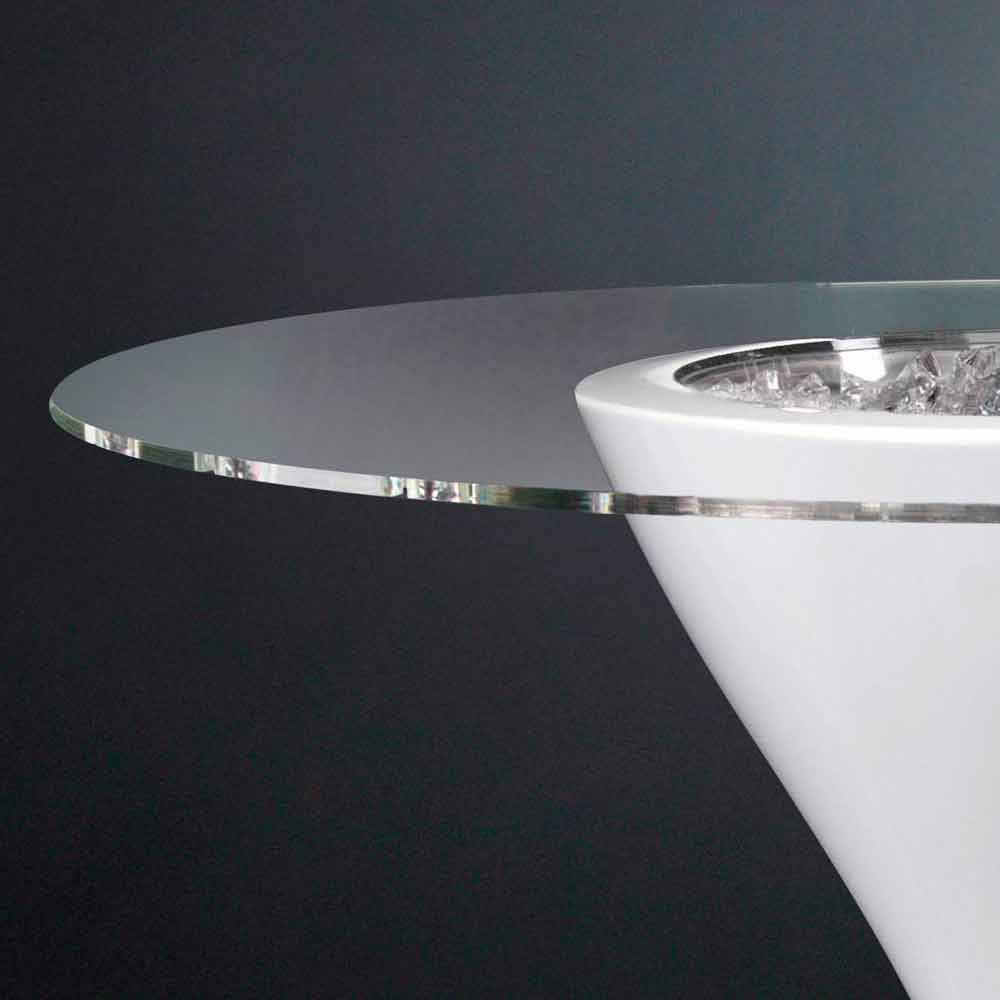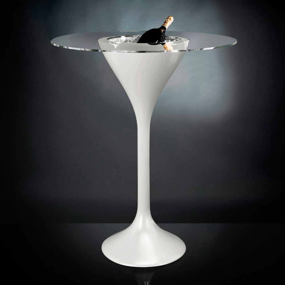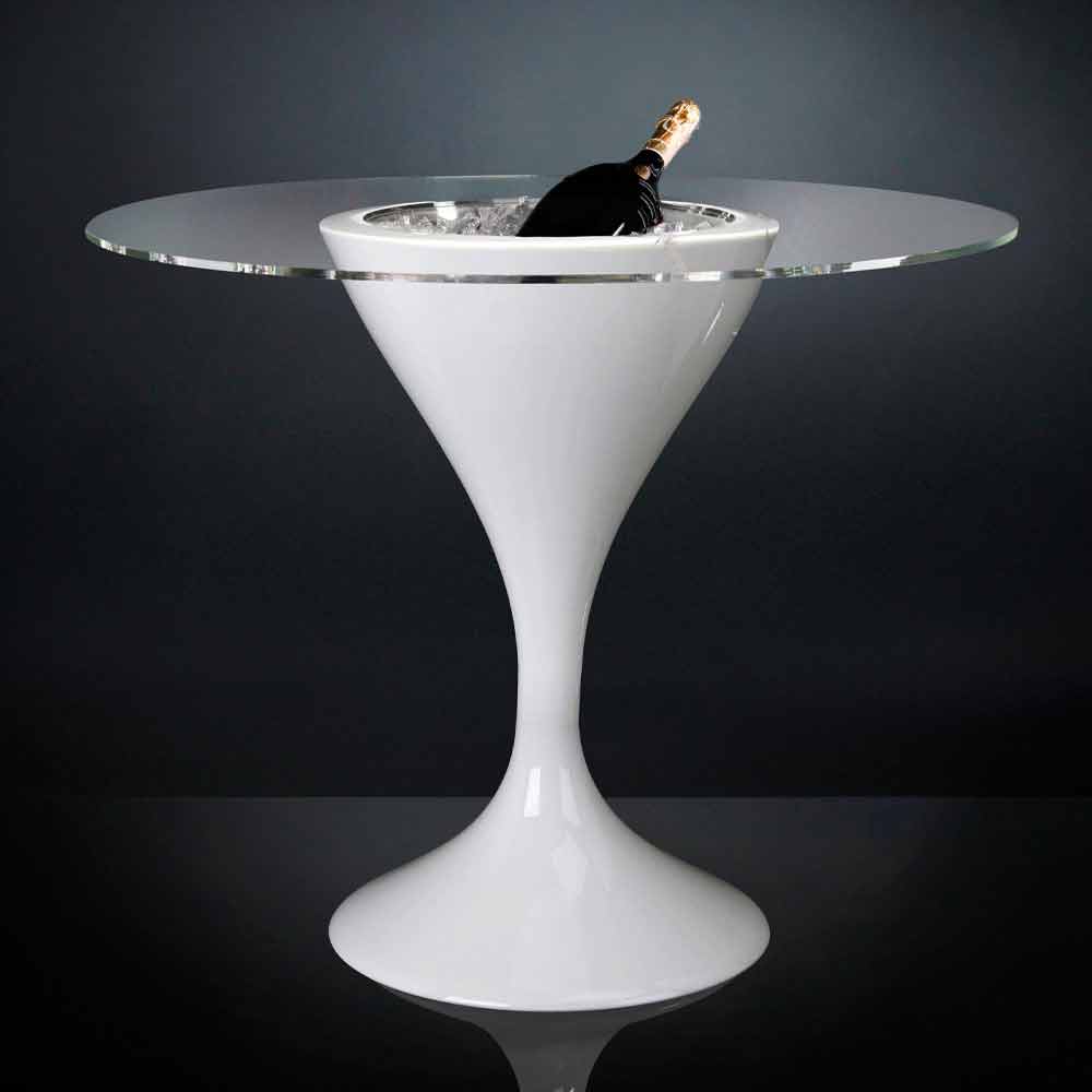 High table entirely made in Italy with round transparent glass top and glossy white polyethylene base. The peculiarity of this modern and eccentric high table is the presence of a practical ice basket positioned in the center of the glass top where you can store your own bottles of wine to keep them cool. Along with this feature, it also has cup holder compartments that can be particularly comfortable and useful for storing glasses in a simple way, leaving the table top free. Made through a 100% Made in Italy processing and the use of innovative raw materials , what is born is a furnishing accessory that marries and embraces the concept of functionality, raising and maximizing it in an innovative and original way for an ideal modern and efficient result. to furnish contract environments but also domestic areas in which to recreate a small and intimate bar.