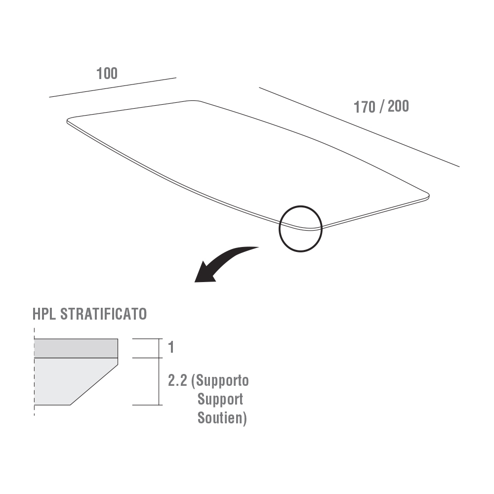 Kitchen table with top in stratified hpl (10 mm thick) stratified with barrel and supported on an MDF plate and legs in