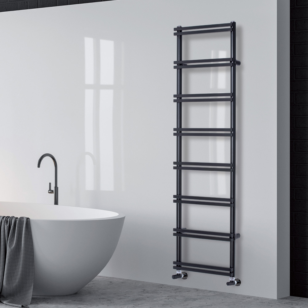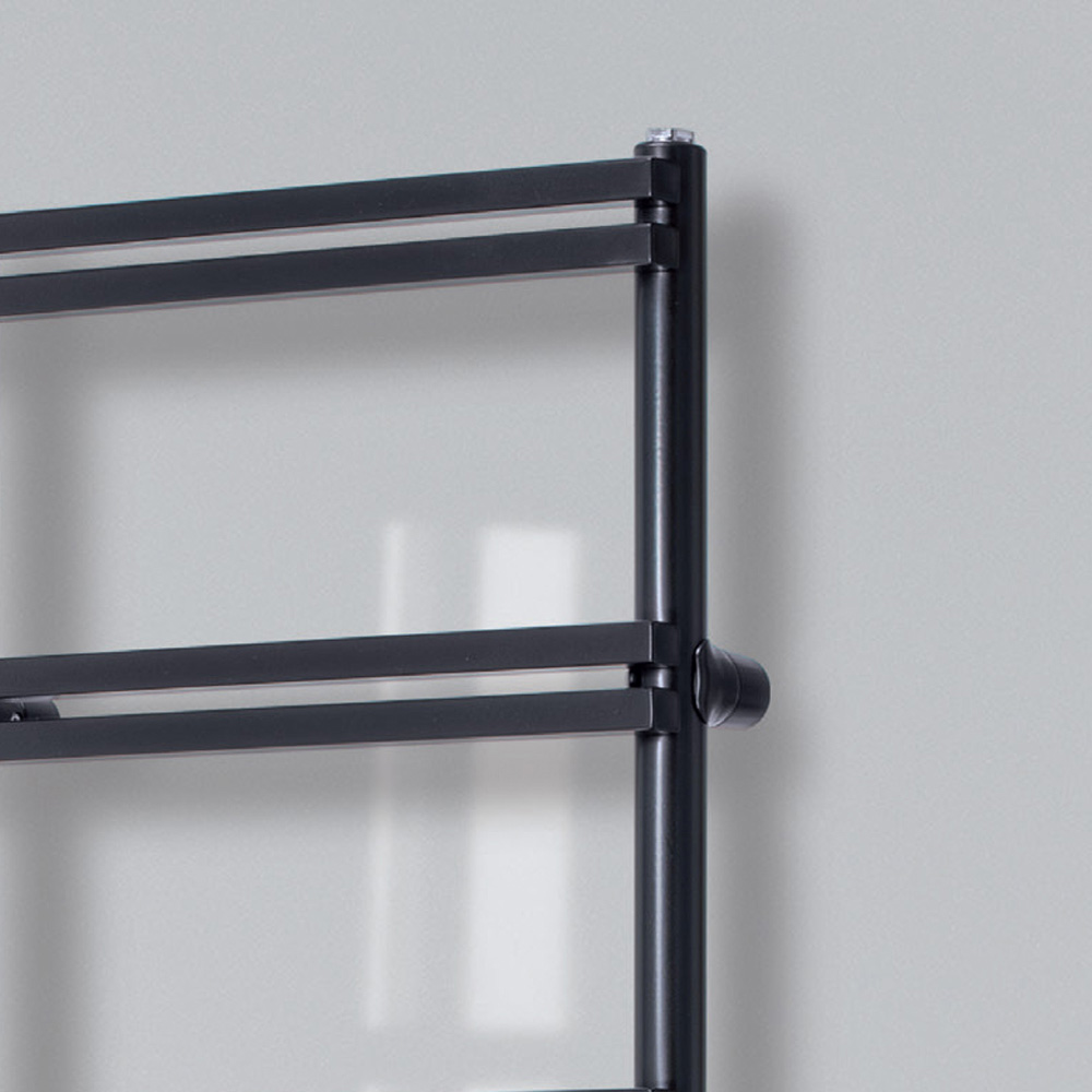 Hydraulic towel warmer in carbon steelwith jet black finish consisting of a series of horizontal elements with a 2 cm square section welded onto vertical manifolds with a diameter of 3.5 cm, entirely made in Italy with wall fixing kit, vent valve and blind cap included . The artisanal nature of this product is the hallmark of the excellent quality typical of Made in Italy. This product satisfies the needs and desires of an increasingly discerning and demanding consumer thanks to the finishes and premium materials used in its construction.
