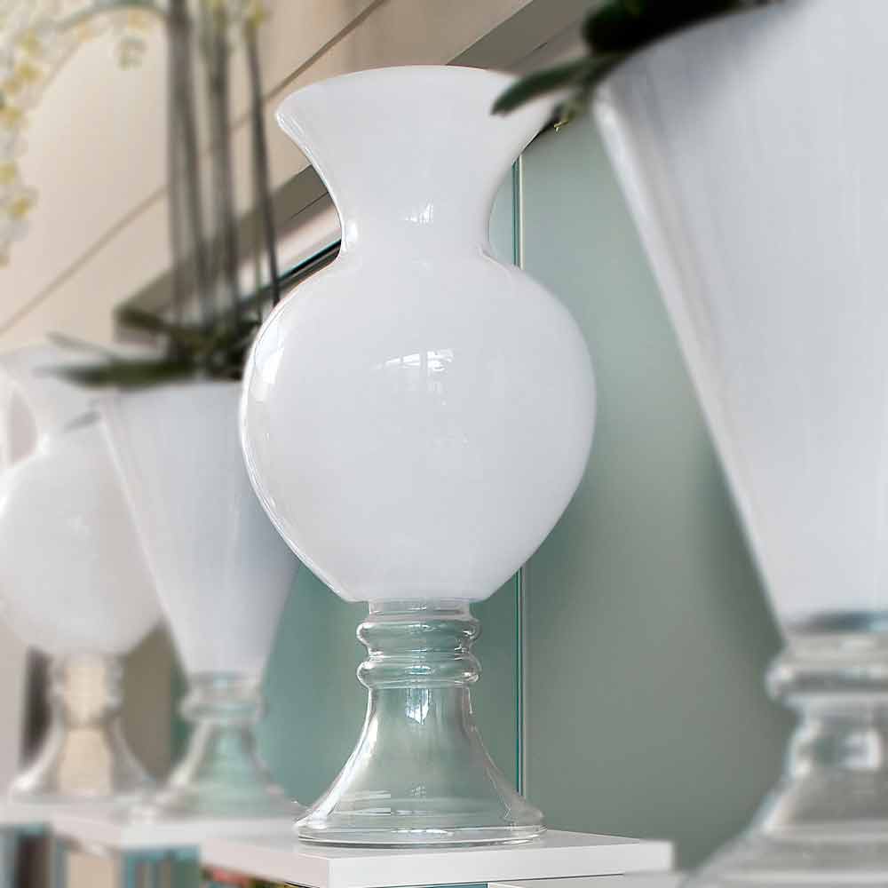 Decorative vase in white glass with transparent base made in Italy through a 100% Made in Italy processing . A structure characterized by soft and sinuous lines that give life to a piece of furniture with a refined soul thanks also to the timeless elegance of glass, a quality material of high value . An ideal design for the most varied environments, from home furnishings to that of hotels, restaurants, contract areas, spas but also as a setting for events and weddings.