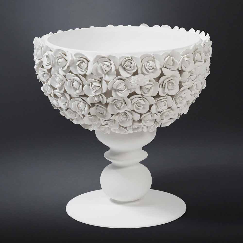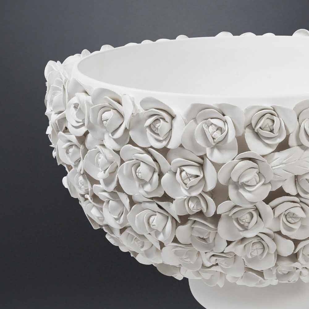 Indoor vasein matt white ceramic handcrafted in Italy. Elegance and classic style are the main features of this wonderful decorative element whose figure is underlined by soft and sinuous lines for a design that brings to mind ancient sculptures typical of Italian art. To enrich the aesthetics is the particular floral processing which increases even more the refined side of the product. The use of ceramics and craftsmanship underline its value and quality for a result capable of adapting to any stylistic situation. An ideal aesthetic for the most varied environments, from home furnishings to that of hotels, restaurants, contract areas, spas but also as a setting for events and weddings.