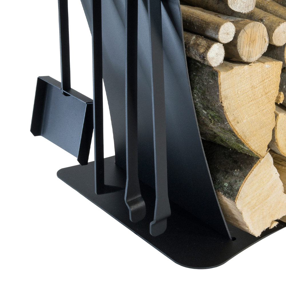 handcrafted in Italy . A piece of furniture that combines the functionality of a log holder with that of its accessories, thus offering the possibility of obtaining everything you need in a single object. The three tools, a