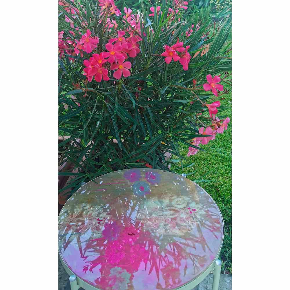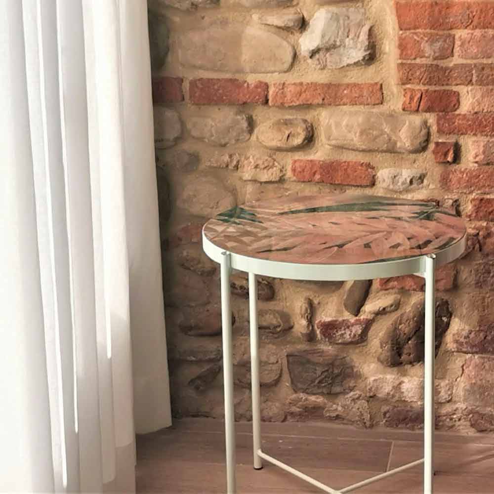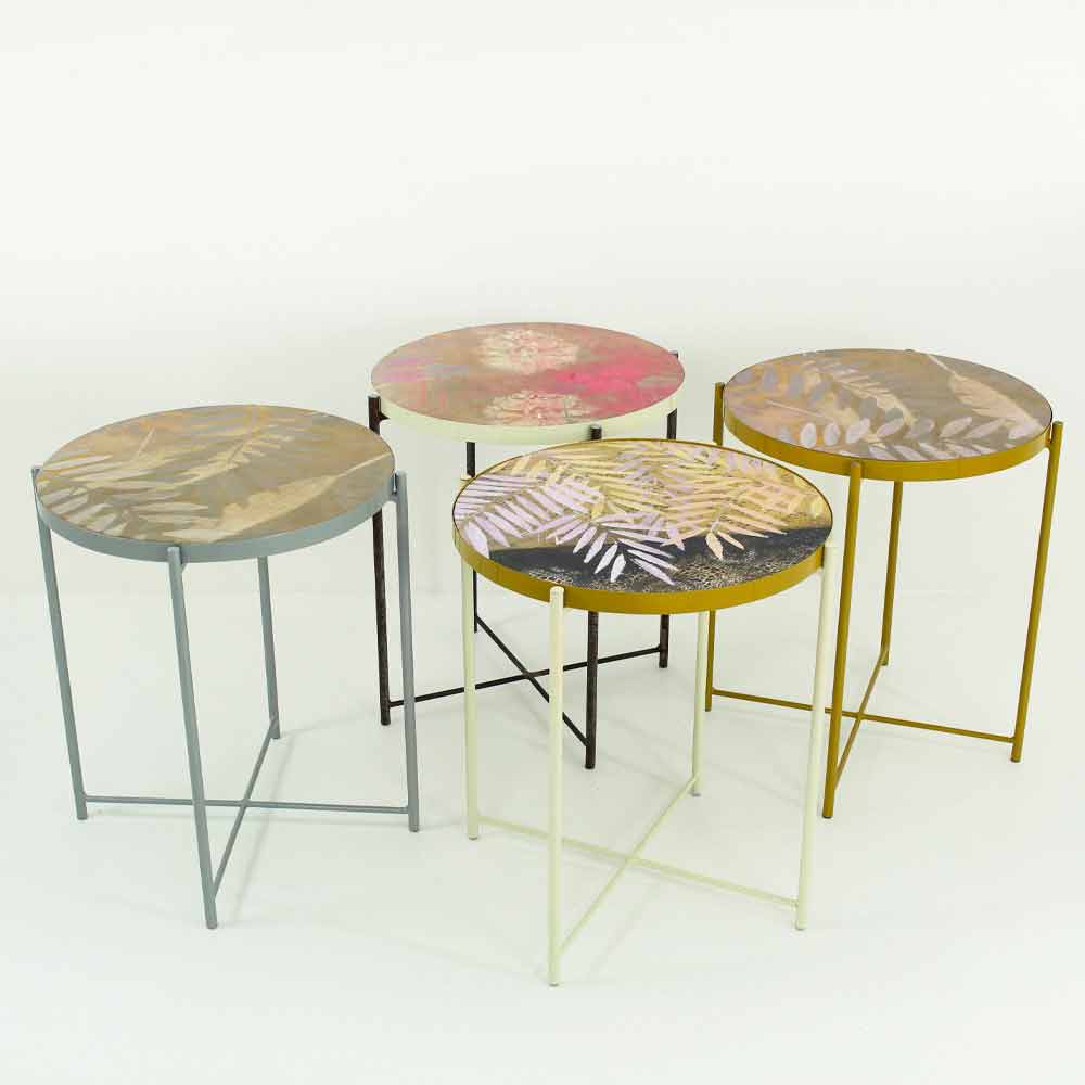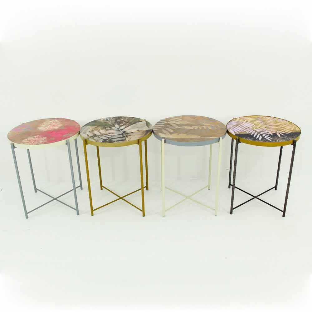 Coffee table for indoors or outdoors with metal base and top decorated and resin-coated Made in Italy.