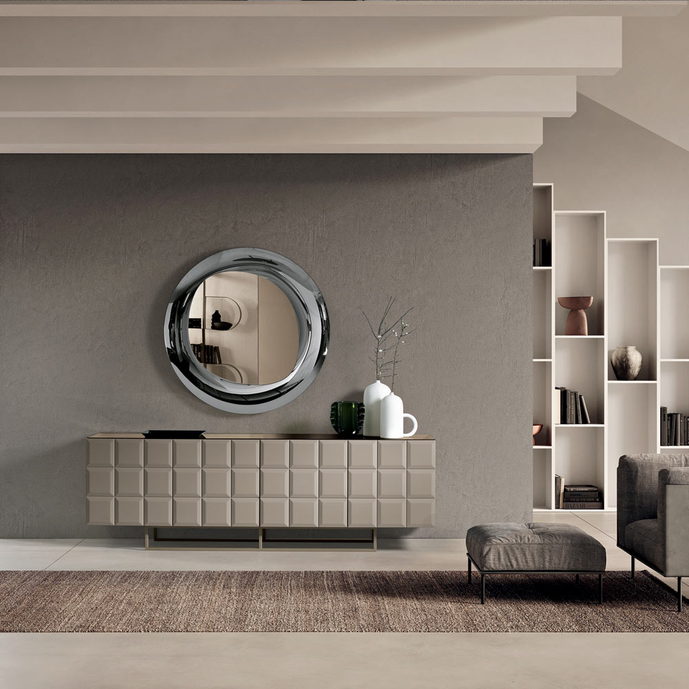 The melamine-faced body pairs with a painted metal base , available in various configurations, which streamlines the structure and lends visual lightness. The sideboard can be completed with a mirrored glass top for an even more sophisticated effect.