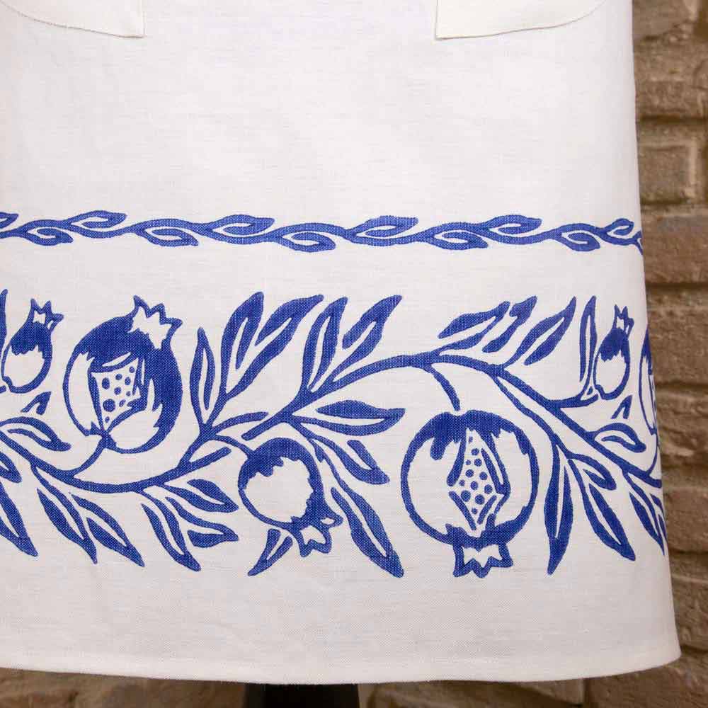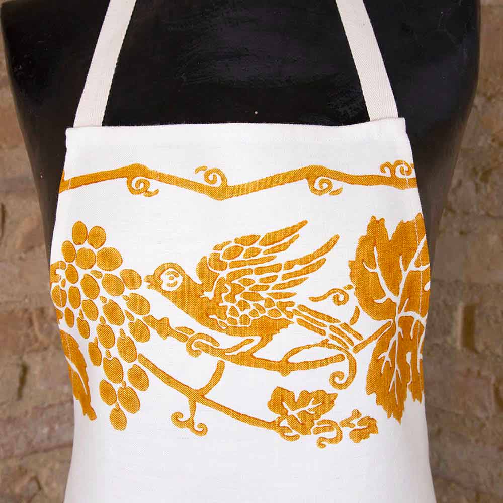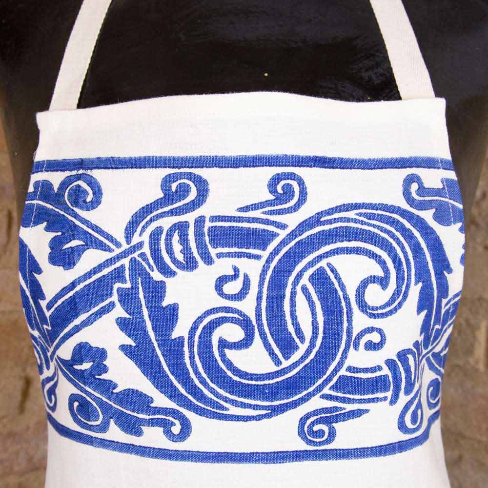 Kitchen apron with bib and pockets of high craftsmanship in pure linen with ancient hand-printed art design, available in three variants, unique piece of Italian quality.