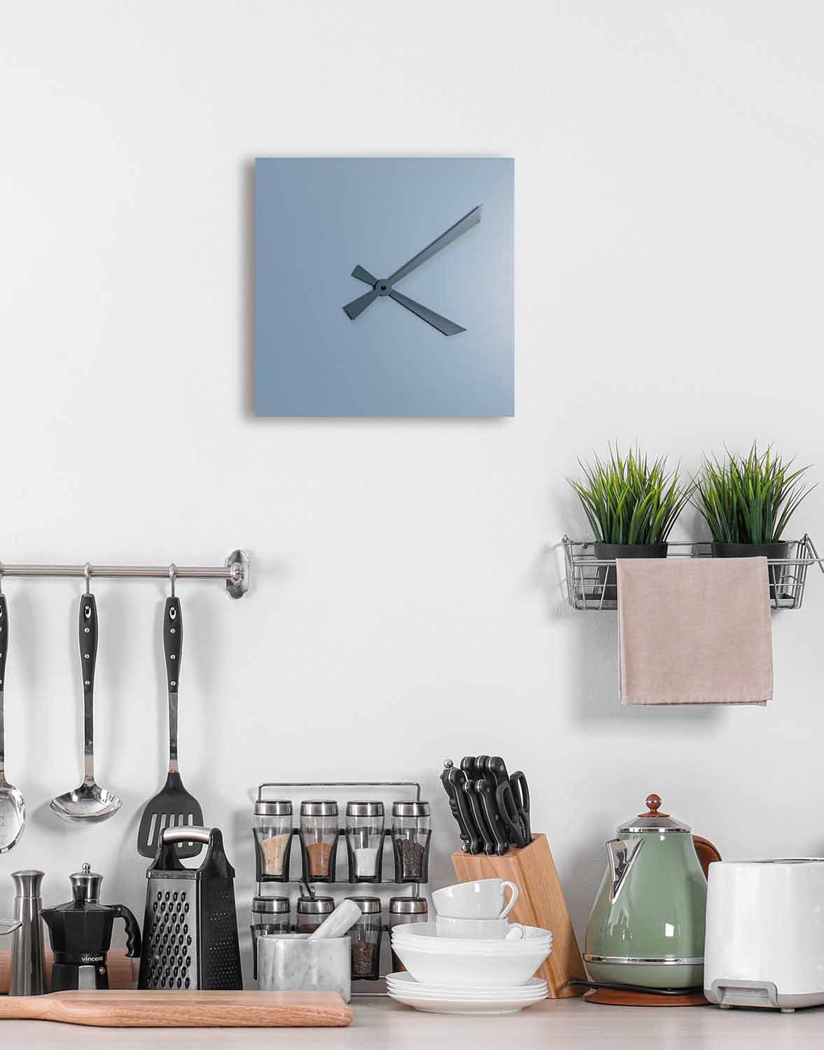 It is a minimal but brightly colored clock that lends itself to decorating different environments, especially those with little space on the walls such as in the kitchen, in a small living room, in an entrance, thanks to its small size . The peculiarity is given by the detail of the hands , which have an original and different color compared to the avio color of the base which, being very versatile , can be combined with different colors such as gray, blue, white.