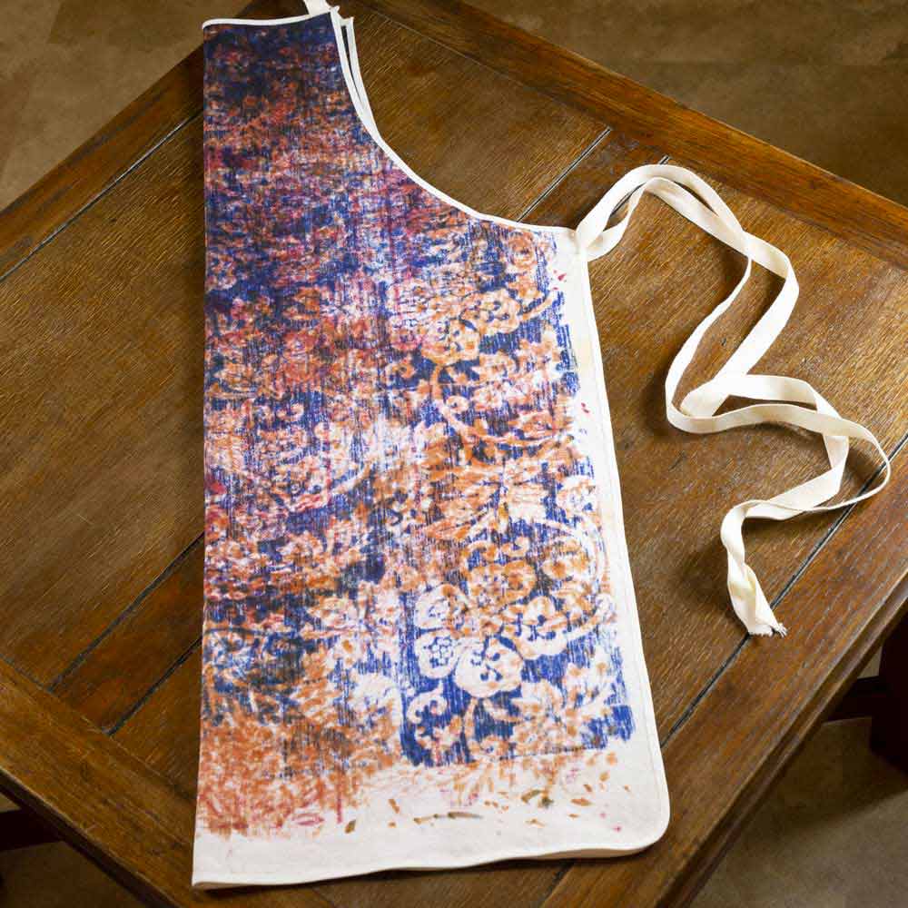 Artistic kitchen apron with bib in pure cotton handcrafted with colored motifs printed by hand, a unique piece of quality made in Italy.