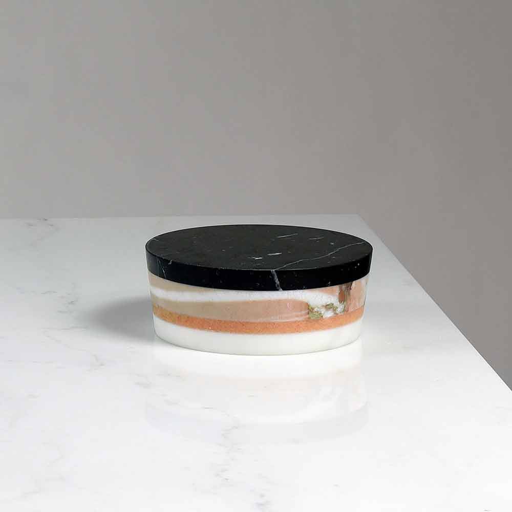 This raised vase is born from the superimposition of marbles with different essences carefully chosen among the waste materials of other processes, guaranteeing environmental and design quality at the same time. It is made up of one layer of white Carraramarble, black Marquiniamarble, pink Portuguese marble and Medici breccia from Vagli.