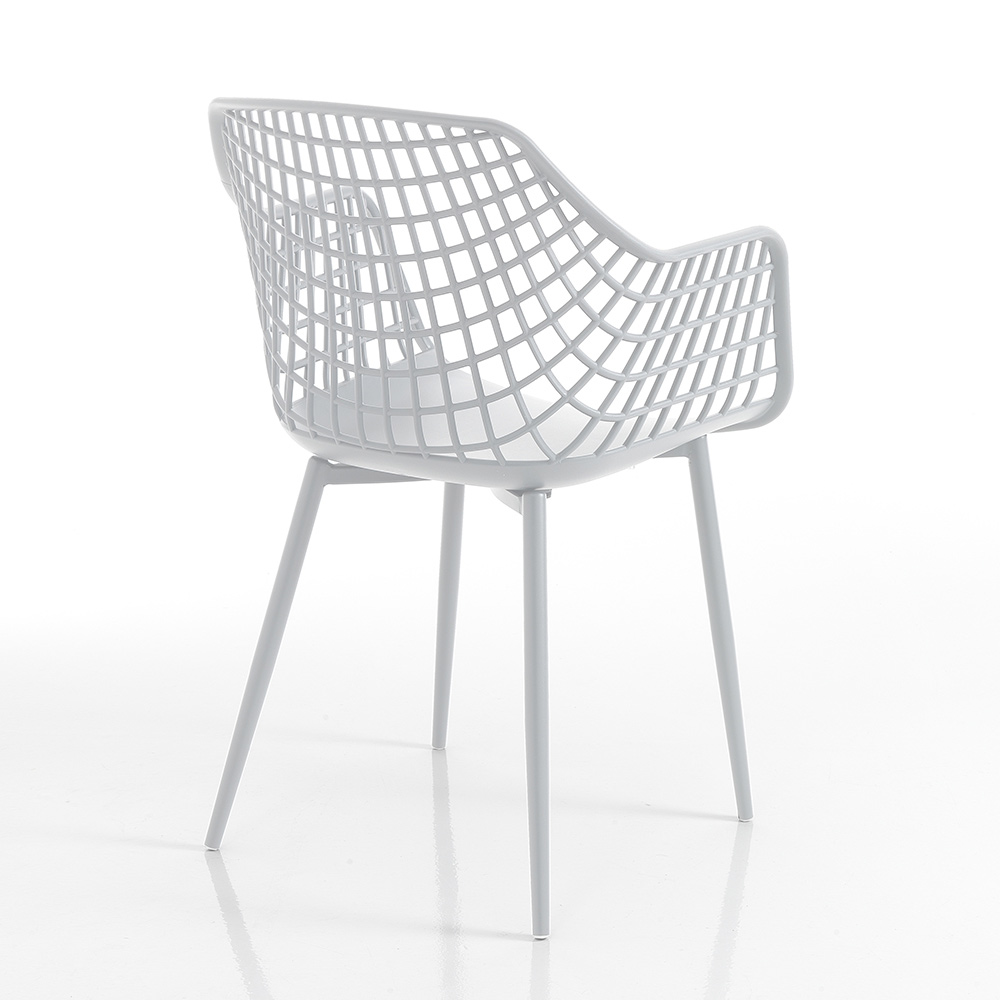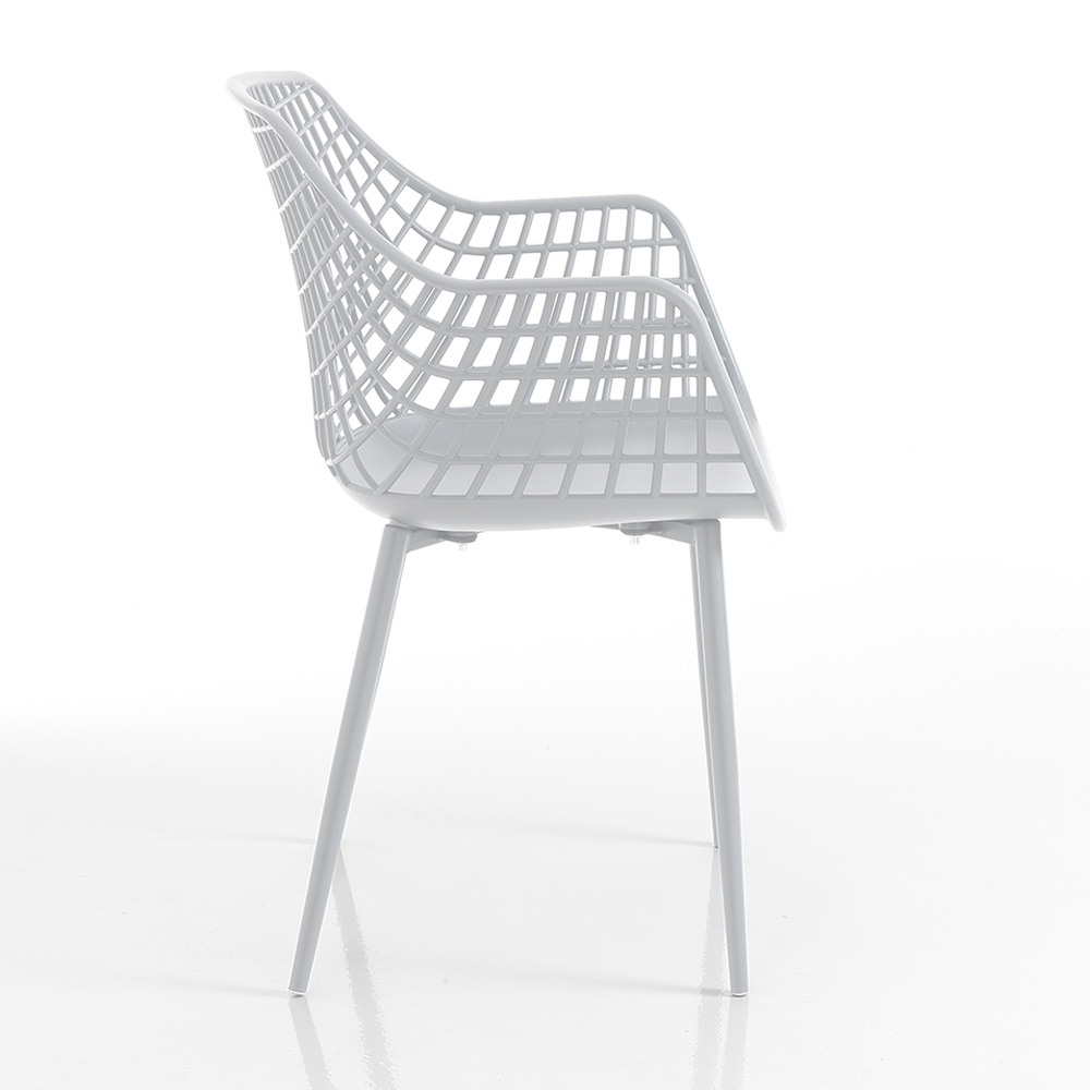 Kitchen chair with seat in opaque polypropylene complete with armrests and legs made of steel coated with protective paint for the outside. A simple and minimal seat whose aesthetics are enriched and made unique by the particular workmanship that characterizes the backrest and which emphasizes its uniqueness. The result is a particularly versatile chair, therefore ideal for the most varied domestic environments but also for contract spaces such as bars and restaurants where it gives a touch of originality to the furniture.