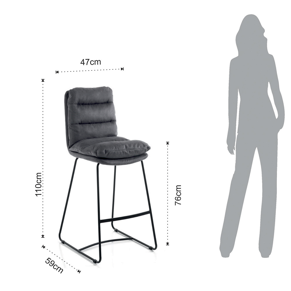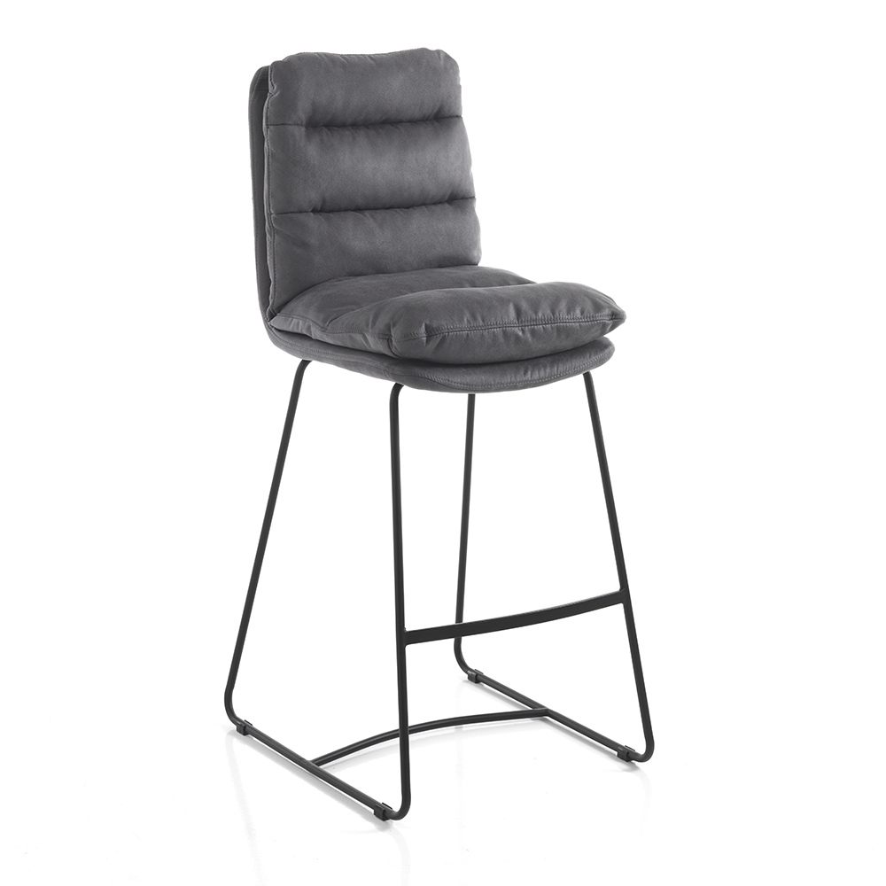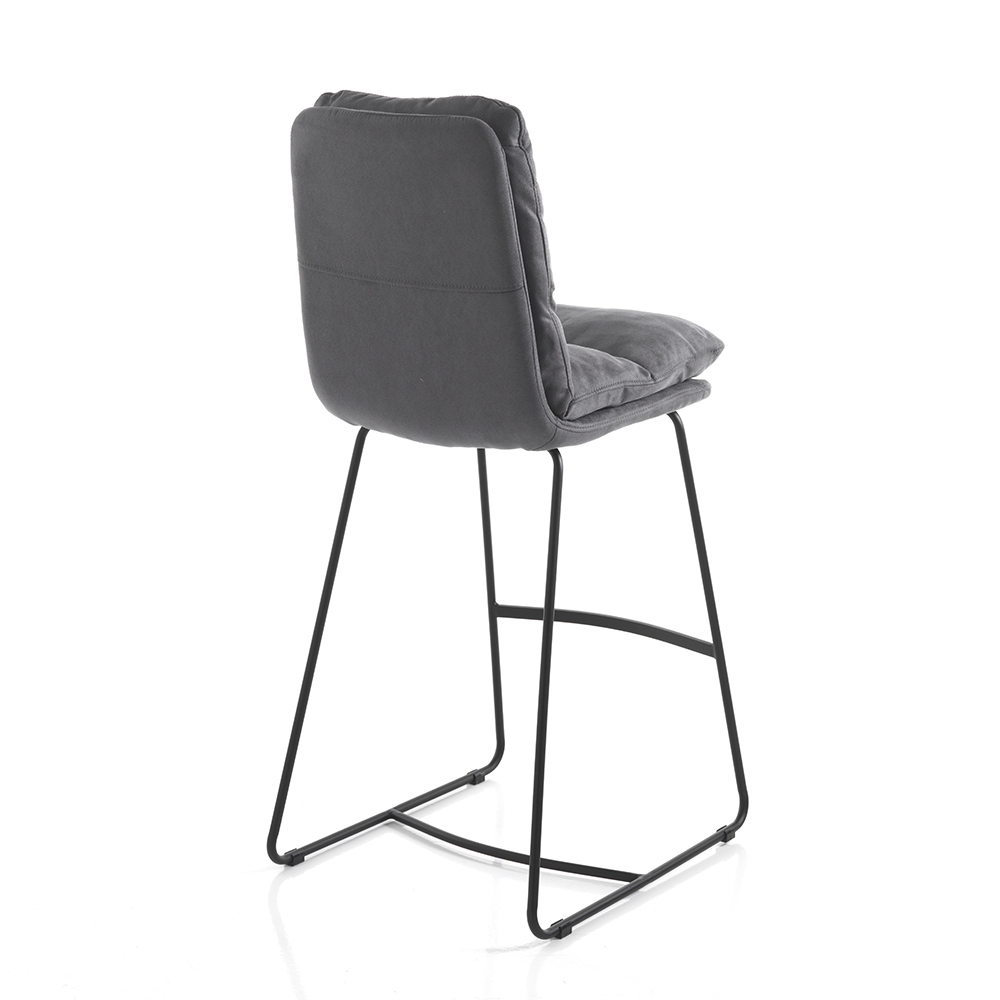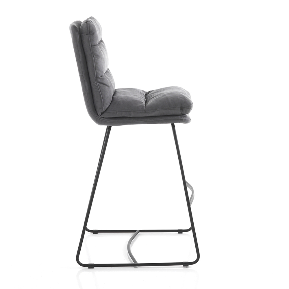 High kitchen stool with sled structure made of matt black painted steel complete with practical footrest and padded seat covered in soft microfiber gray velvet effect . A product whose aesthetics are marked by simple lines and shapes enriched by the elegant quilting that covers the entire seat, giving even more a wonderful feeling of comfort. Ideal to be placed in the dining room and kitchen but also in contract spaces such as bars and restaurants thanks to the elegant and refined design and its versatility of use.