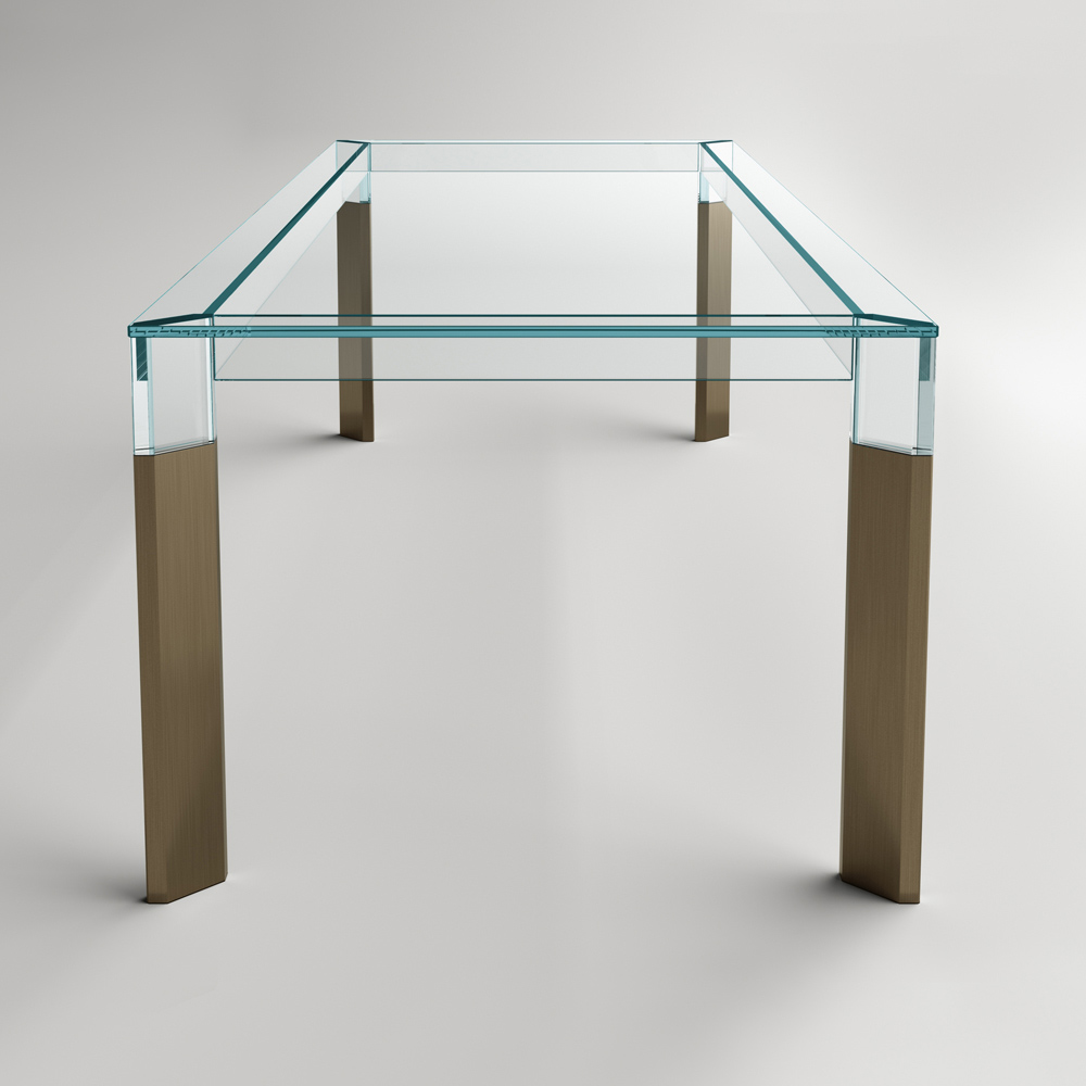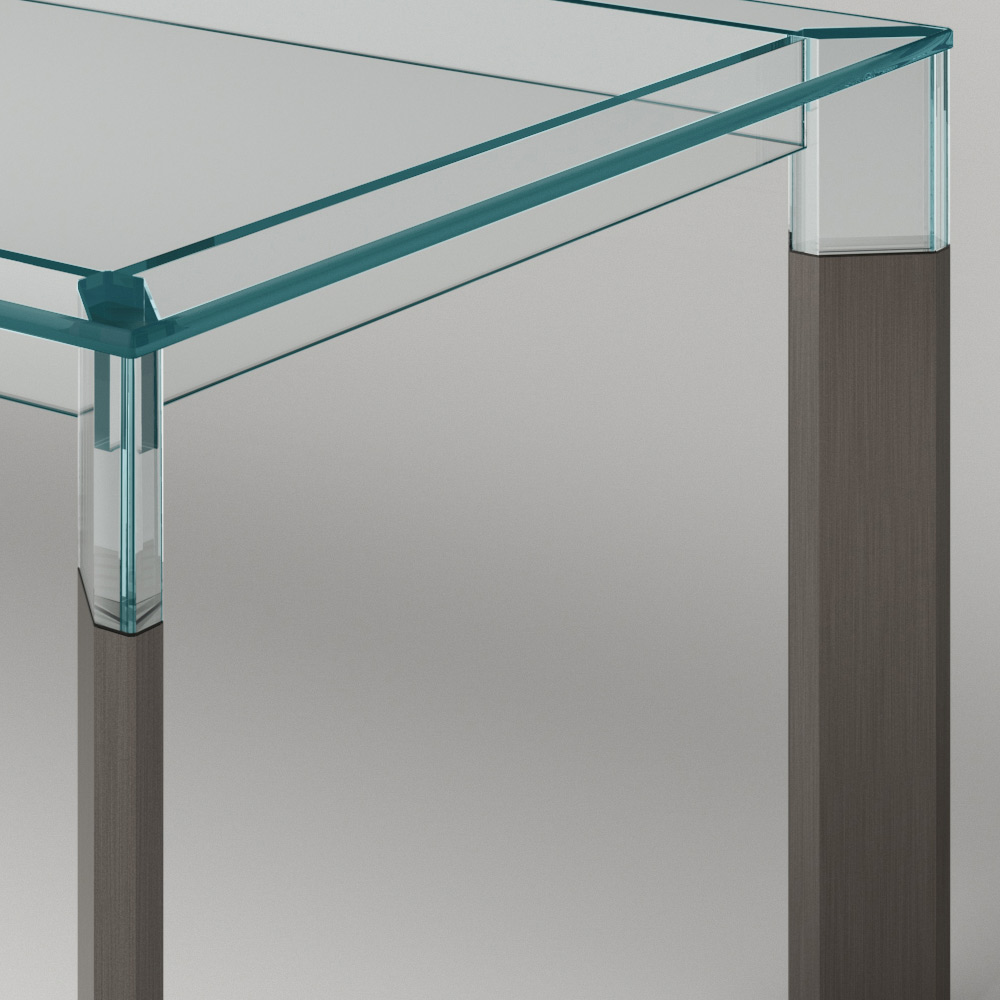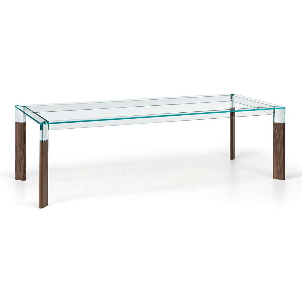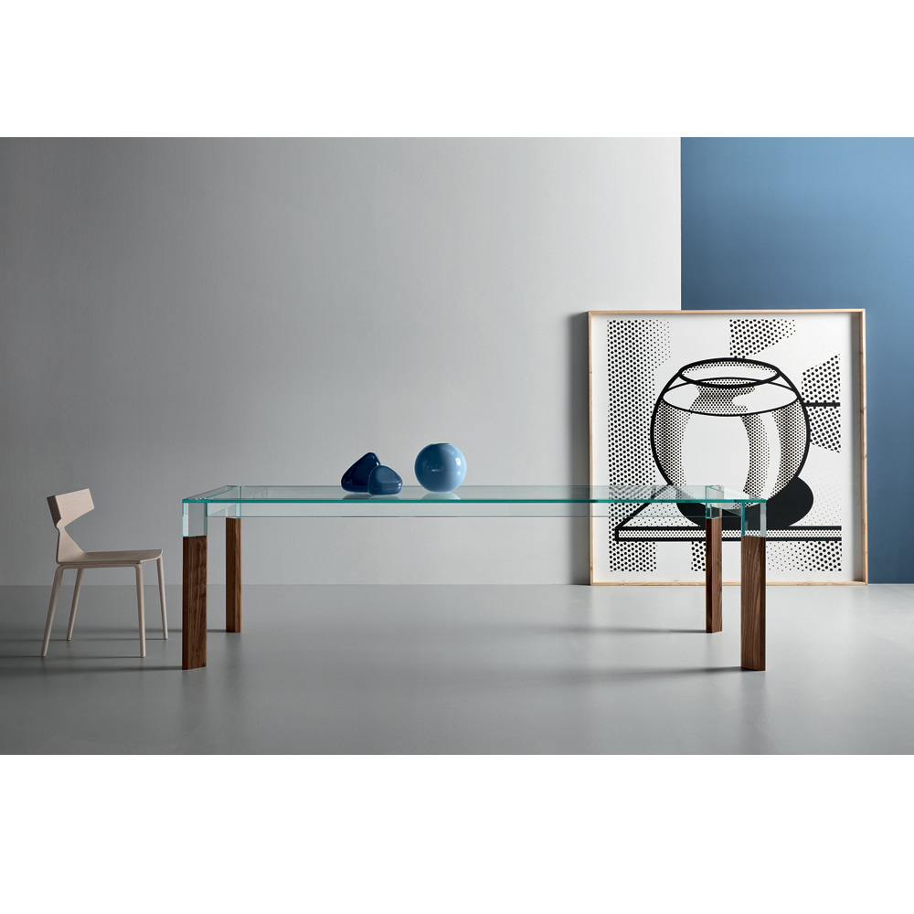 Dining table entirely made in Italy with glass top and legs in glass and solid wood . A timeless furnishing solution, suitable for different styles, capable of underlining the perfect union between the elegance of glass and the grandeur of wood, favoring its versatility of use within domestic spaces. A great protagonist of the living area characterized by complex construction techniques used by skilled Italian artisans to create a high quality and particularly functional dining table . The result is a harmony of simple lines and shapes that create the perfect idea to furnish dining rooms or kitchens with a contemporary style in an exclusive and refined way, conquering the center of attention and making moments in company unique.