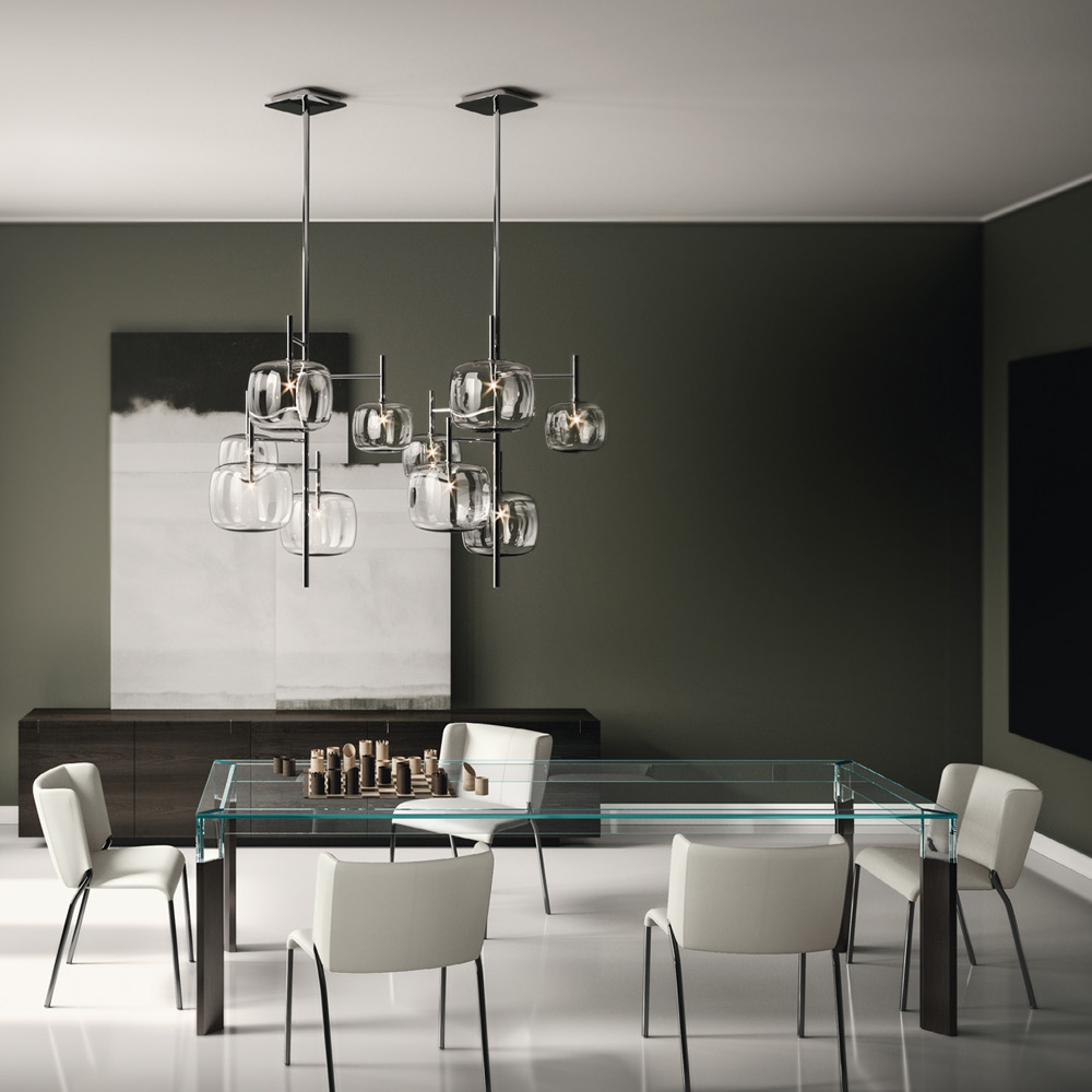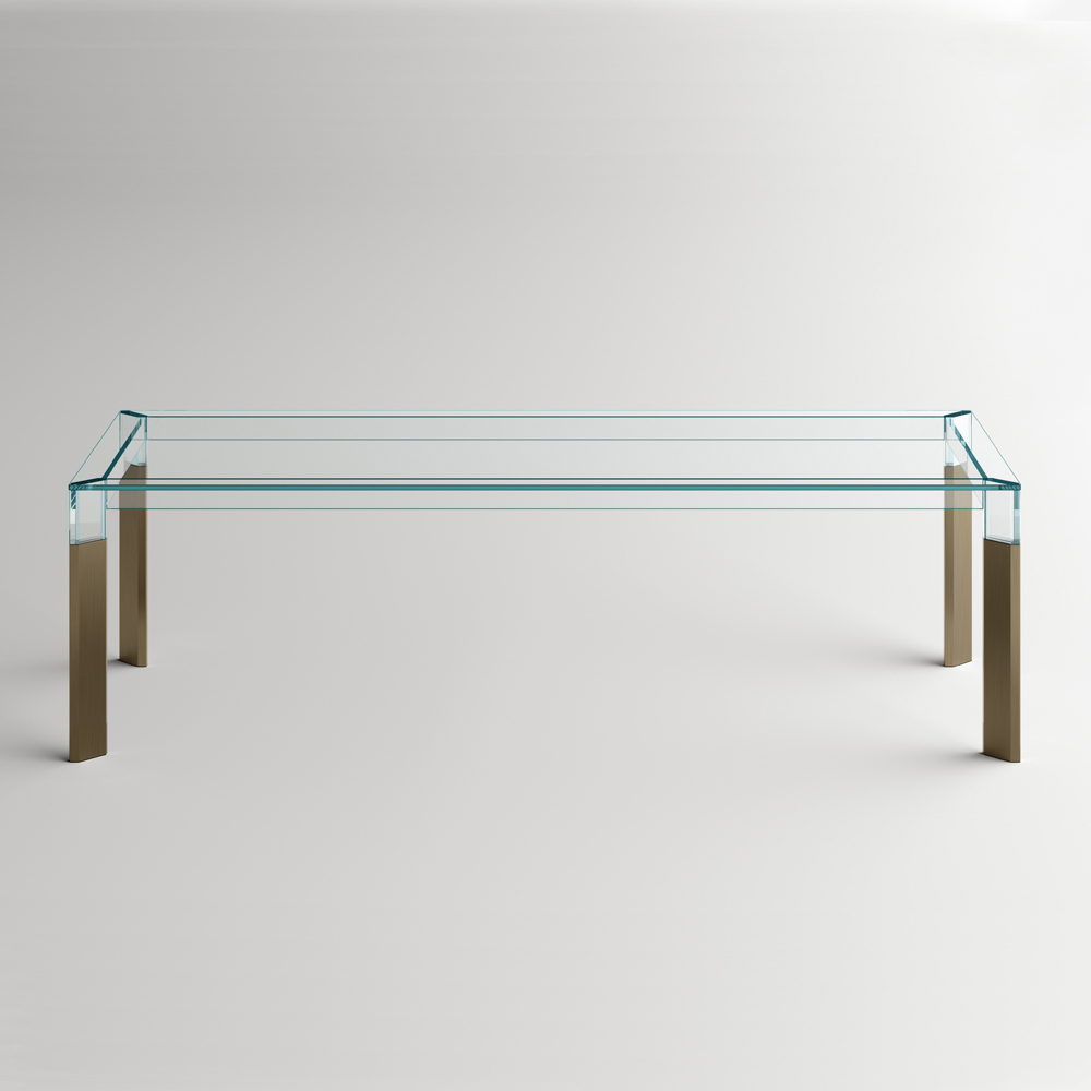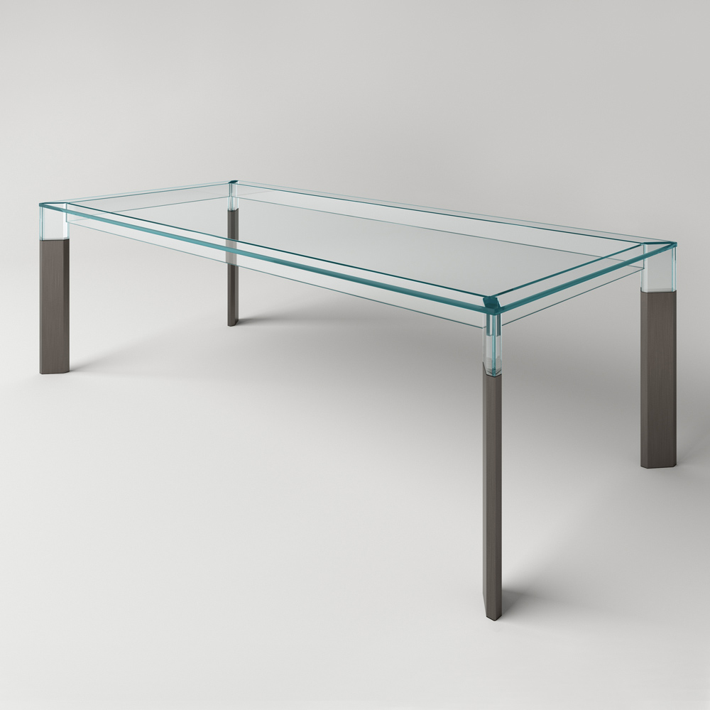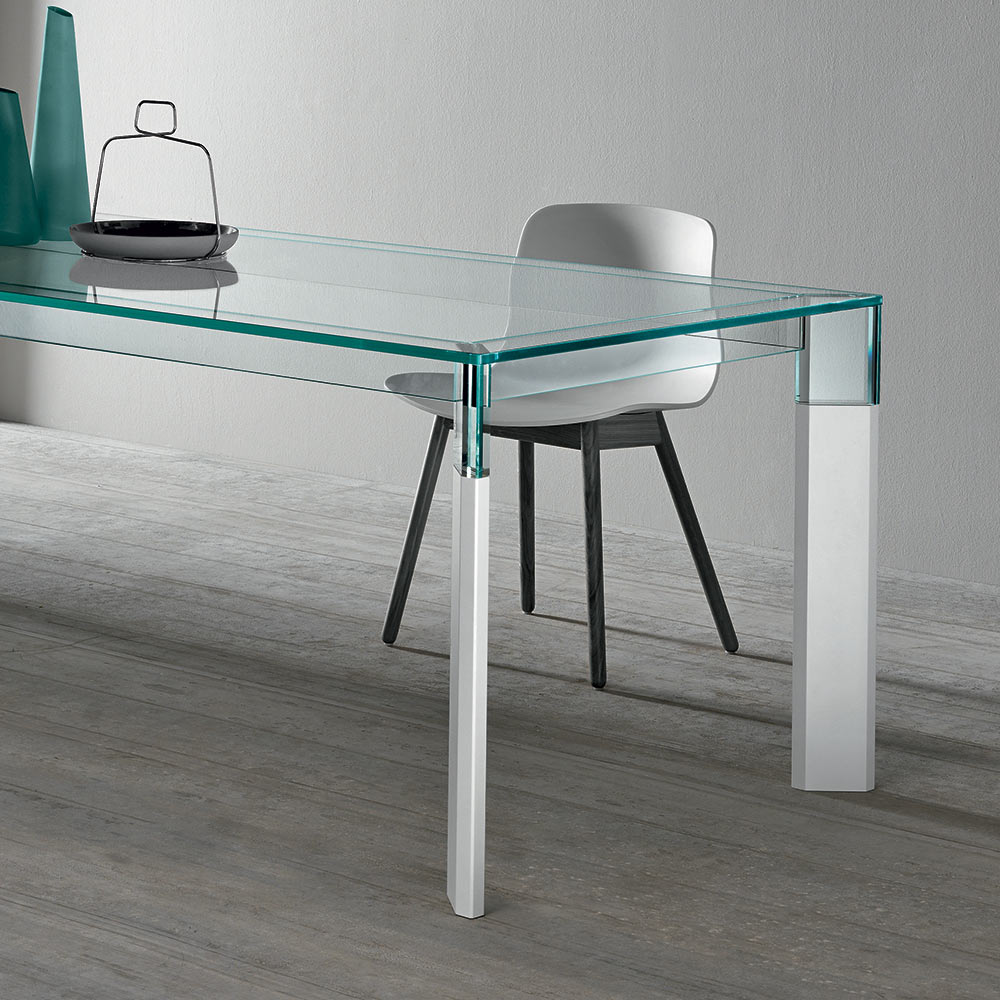 Dining table entirely made in Italy with glass top and legs in glass and solid wood . A timeless furnishing solution, suitable for different styles, capable of underlining the perfect union between the elegance of glass and the grandeur of wood, favoring its versatility of use within domestic spaces. A great protagonist of the living area characterized by complex construction techniques used by skilled Italian artisans to create a high quality and particularly functional dining table . The result is a harmony of simple lines and shapes that create the perfect idea to furnish dining rooms or kitchens with a contemporary style in an exclusive and refined way, conquering the center of attention and making moments in company unique.